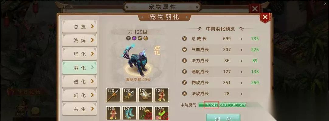 1.角色等级要求 羽化功能不是对所有玩家开放的。只有当角色达到一定等级时,羽化功能才会解锁。通常,该等级门槛设置在角色达到100级至110级之间,玩家需要先确保自己的角色达到了这个级别。 2.特定任务完成 开启羽化之前,玩家需要完成一系列前置任务。这些任务往往包含了寻找特定NPC、收集材料或参与战斗等元素,旨在检验玩家的游戏进度和能力。 3.羽化石或羽化丹 羽化不仅仅是一个机制,它还涉及到了游戏内的货币和材料。通常情况下,玩家需要准备一定数量的羽化石或羽化丹,这些是开启羽化的关键物品。玩家通常需要通过游戏内的任务奖励、市场购买或特殊活动获取。 4.经验值储备 尽管不是严格的要求,但开启羽化之前积累足够的经验值也是非常关键的。因为羽化后角色会得到一个较大的经验值加成,这意味着玩家可以在羽化后更快地升级。
