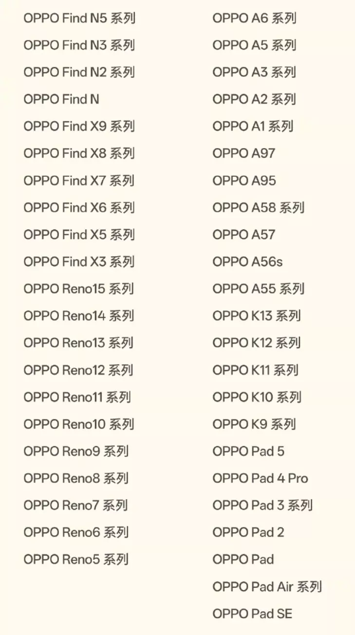 据悉,ColorOS 16二月更新已经从2月3日起开始分批更新,预计将在28日前完成推送,覆盖ColorOS 13以上的超100款机型,具体如下:OPPO系产品: