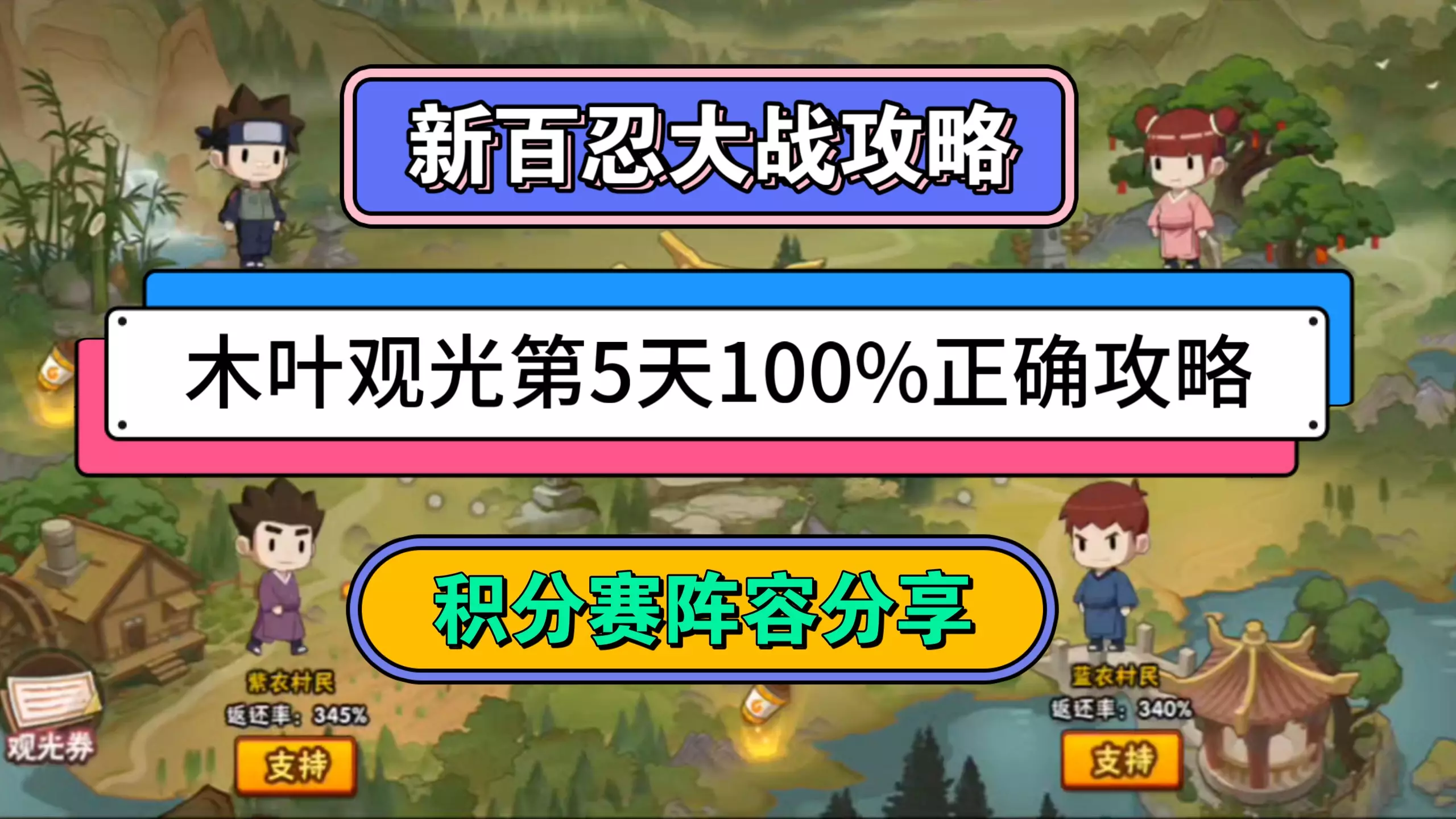 这是火影忍者手游的攻略内容,带来了木叶观光第7天的100%正确攻略,即支持粉衣村民,还提示玩家留存体力参与药草大冒险迪达拉活动,同时展示了忍战带土等忍者的对战内容。