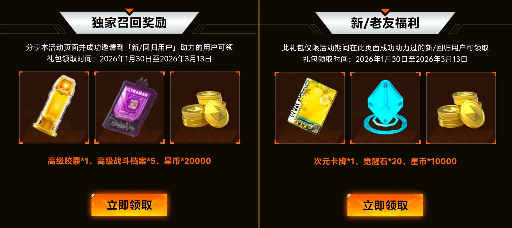 玩家只需通过活动成功邀请到新/回归用户助力,即可获得:高级胶囊*1、高级战斗档案*5、星币*20000