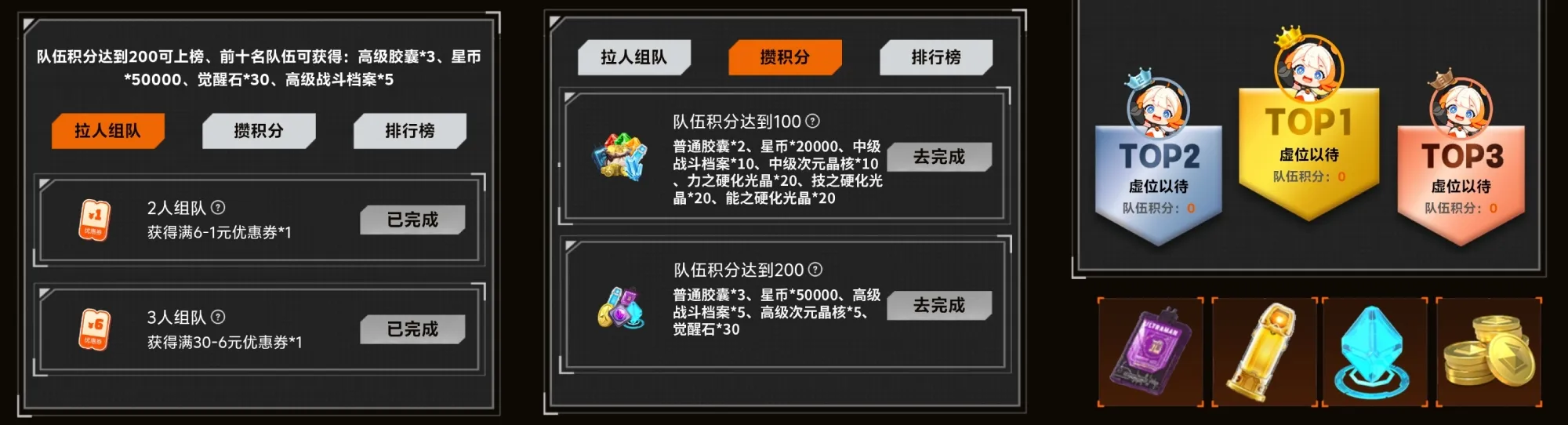 在活动结束前排名前十名的队伍,队员均可领取专属排名奖励:高级胶囊*3、星币*50000、觉醒石*30、高级战斗档案*5