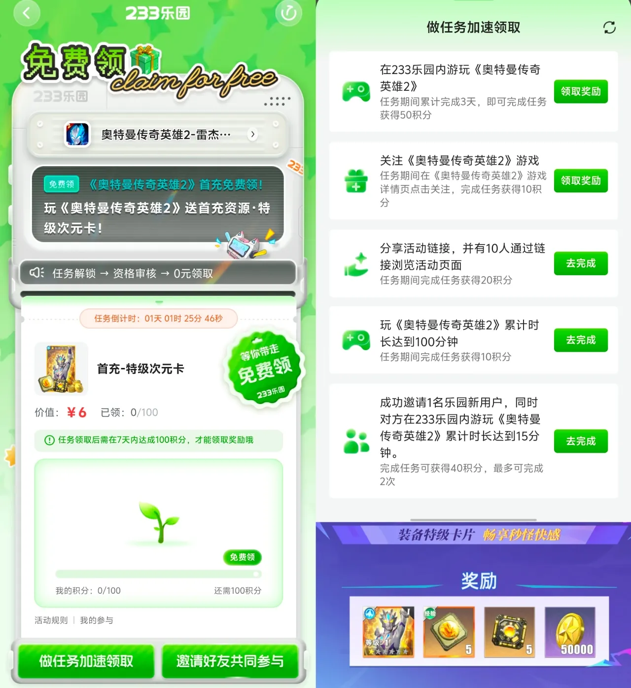 前往233乐园参与免费领活动,完成任务即可免费获得价值6元首充-特级次元卡奖励:[超越极限I]*1、特级次元晶核*5、进阶卡*5、星币*50000