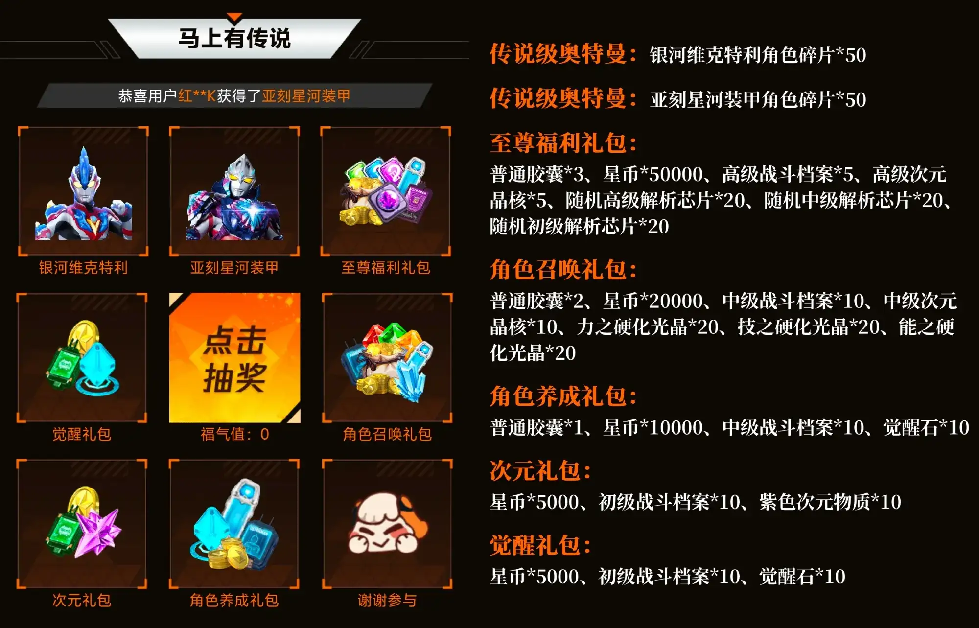 233乐园也为各位奥特战士奉上丰富的新春福利好礼:参与活动,赢最新&人气传说角色、大量高级胶囊等礼包福利!更有首充特级次元卡你免费领!