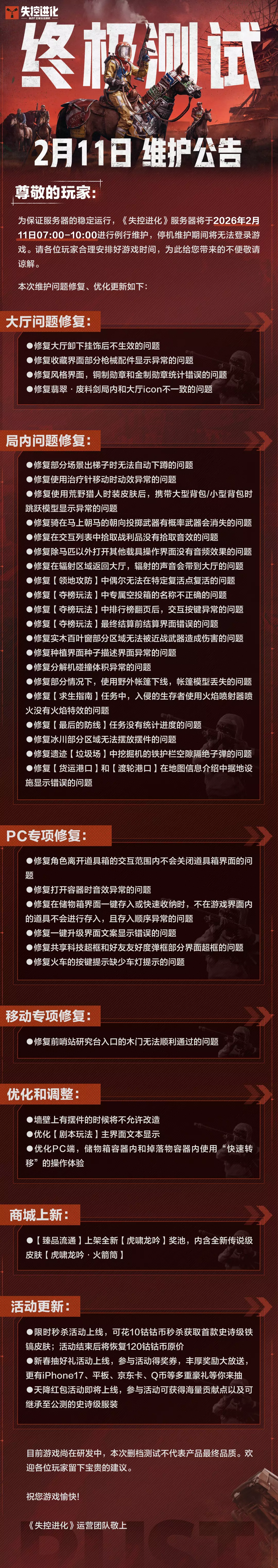 《失控进化》终极测试服务器将于2026年2月11日07:00-10:00例行维护,维护期间无法登录游戏。本次维护将修复大厅、局内、PC端、移动端的诸多问题,还将进行优化调整,同时商城上新相关内容,还有限时秒杀等活动上线。