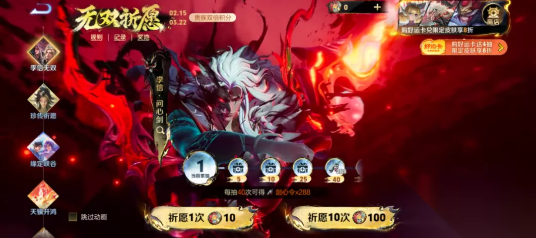 📜开马年好运卡,最高送珍品传说祈愿【20抽】!最高送20抽,开卡领10抽,拥有任意一款本期珍品传说皮肤且在珍品传说祈愿中完成40次祈愿再领10抽!详情请见官网活动公告。
