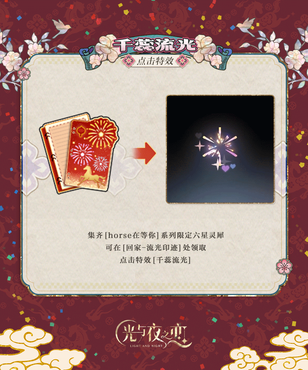 集齐[horse在等你]系列限定六星灵犀,可在[回家-流光印迹]处领取点击特效[千蕊流光]。