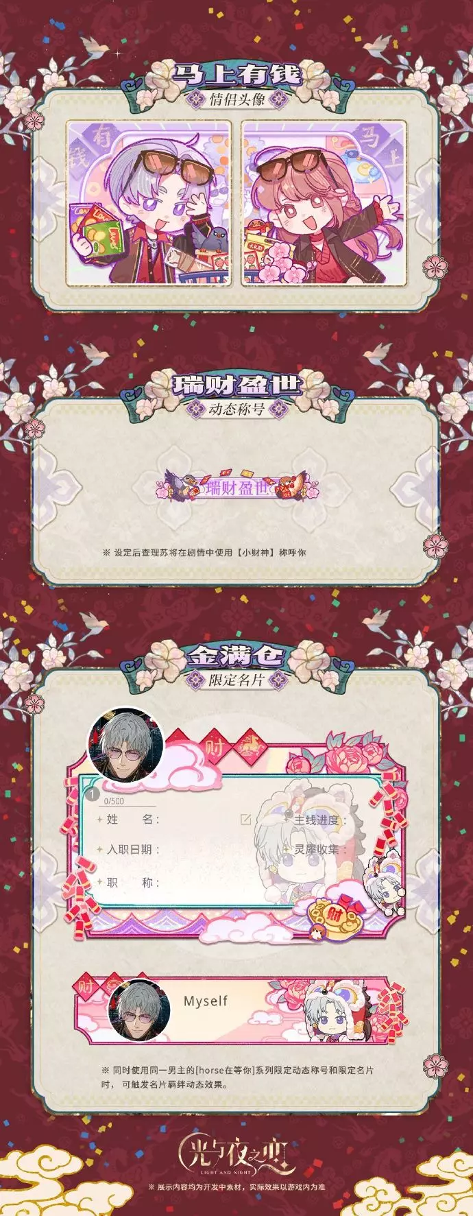 活动期间累计收信210次/240次/270次/320次/350次时,各可在限时计划处领取[名片礼盒],打开后可随机获得以下任一限定名片奖励:[春载归] [锦鳞跃] [鹤迎岁] [金满仓] [吉星照](不会重复获得)。
