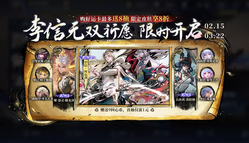 王者荣耀墨染江湖第二回推出李信-问心剑无双限定皮肤,可通过2月15日-3月22日的无双祈愿活动获取,首抽低至10点券,开马年好运卡最高得8抽。皮肤以水墨武侠为主题,李信拥有栖梧剑、潜渊剑双重身份,三种形态的造型、技能特效、音乐音效均围绕水墨、金凤、墨龙打造,极具武侠氛围感。