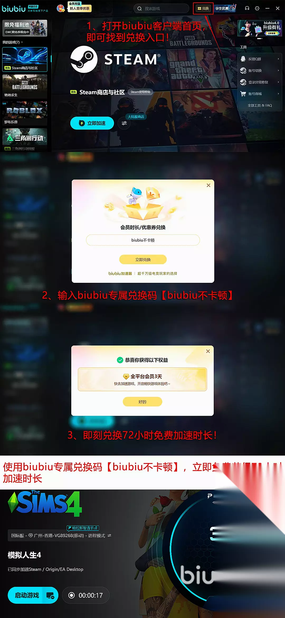 同时新用户完成注册后可立即获得24小时全游戏不限速的免费加速体验,让所有用户还能在加速器的兑换中心输入专属口令【biubiu不卡顿】,额外领取3天的免费加速时长,其中新用户还可以叠加福利,获得96小时的加速哦。