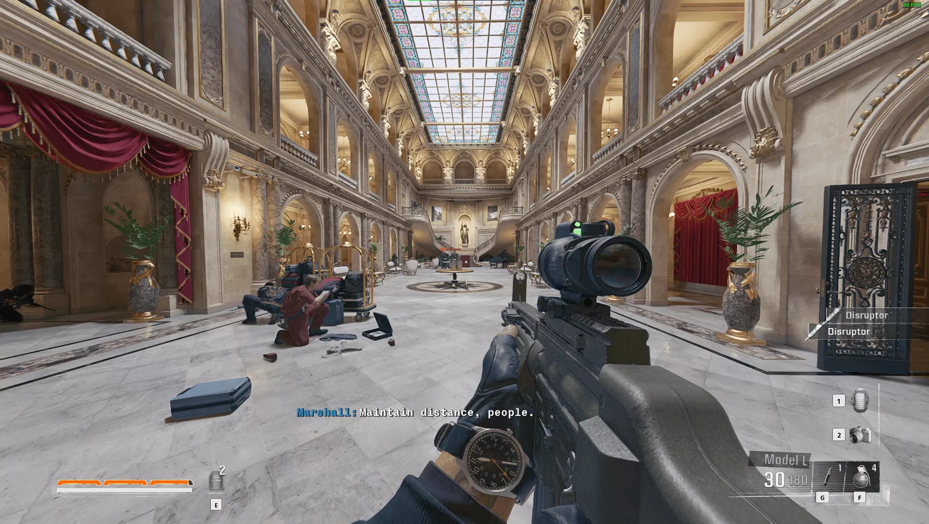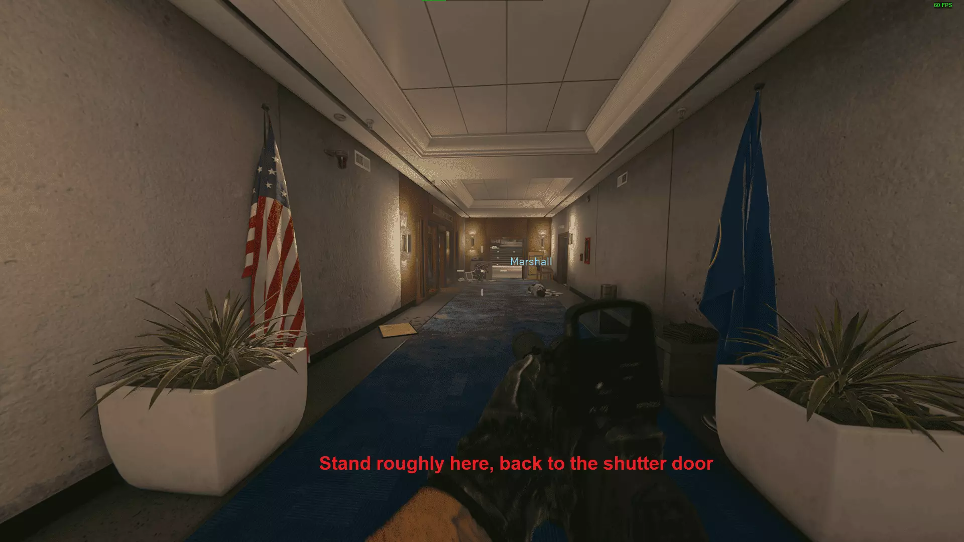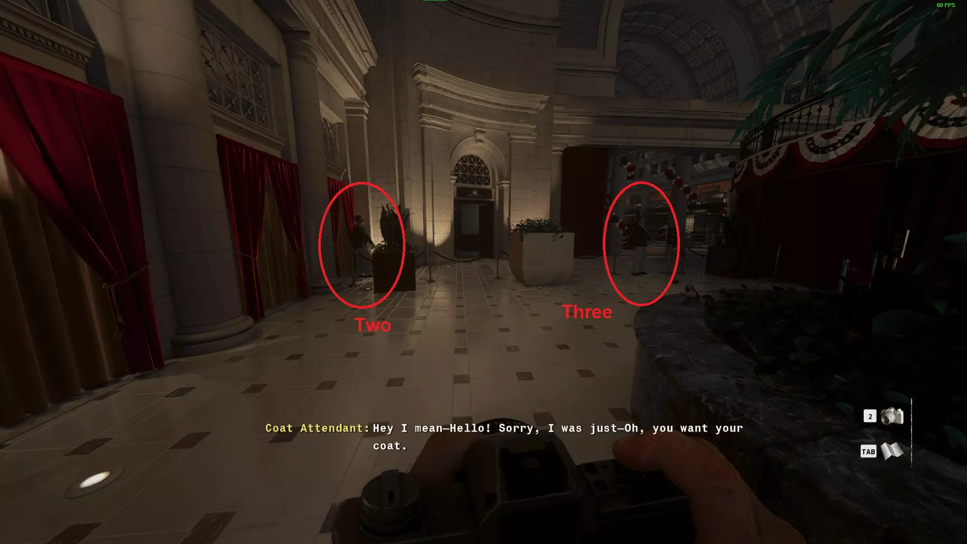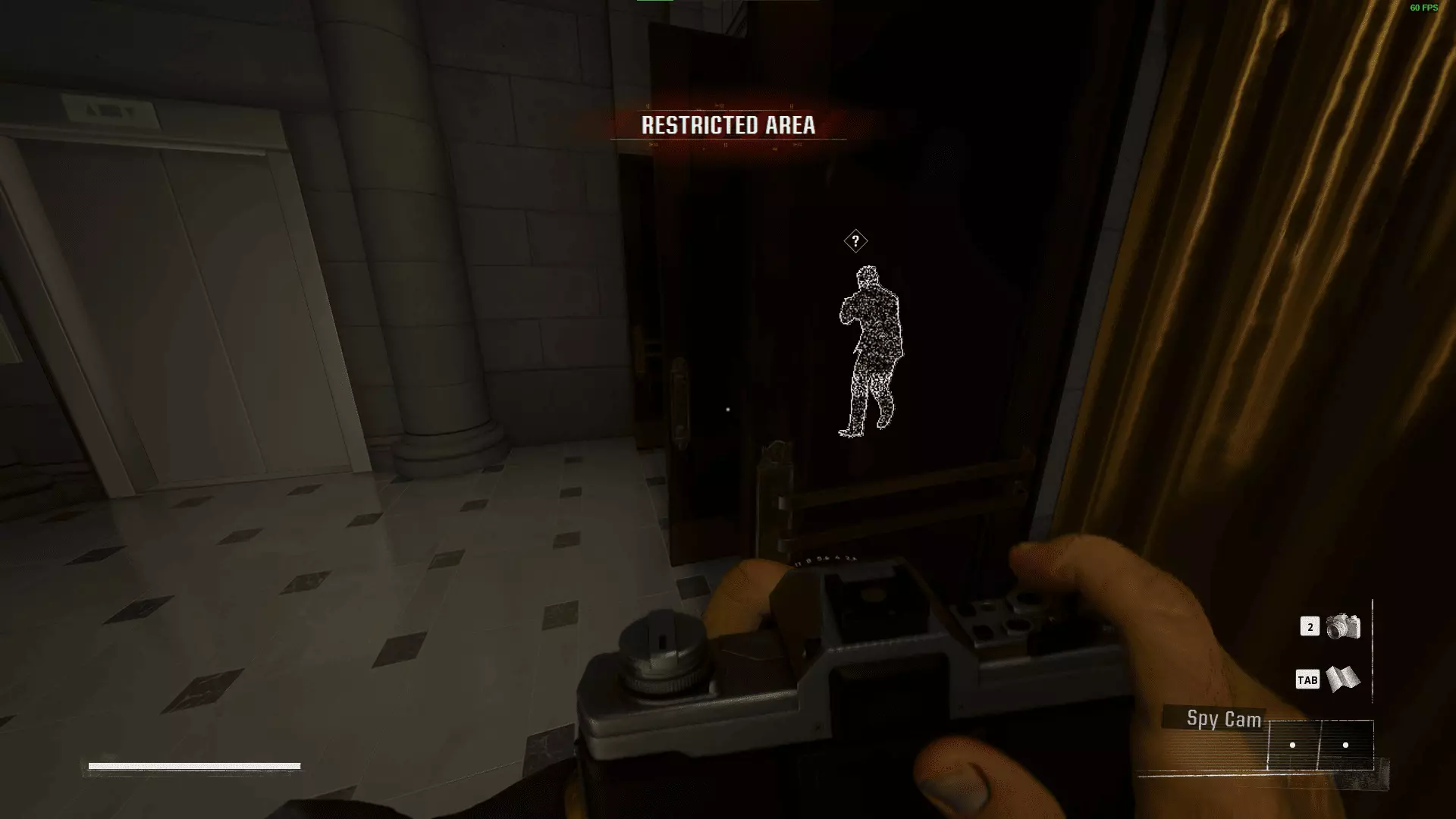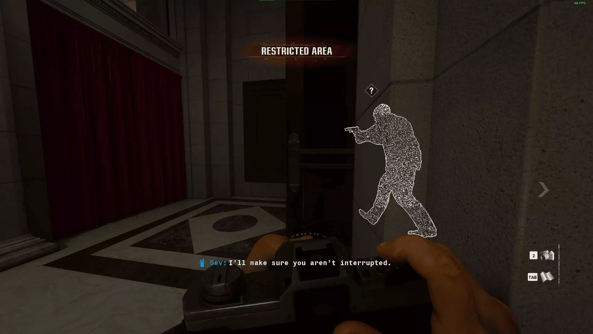 下一批在西翼区域内。沿着左侧的门前往员工专用区域,然后通过那扇开着的门进入西翼。在这里你可以标记最后2名守卫。