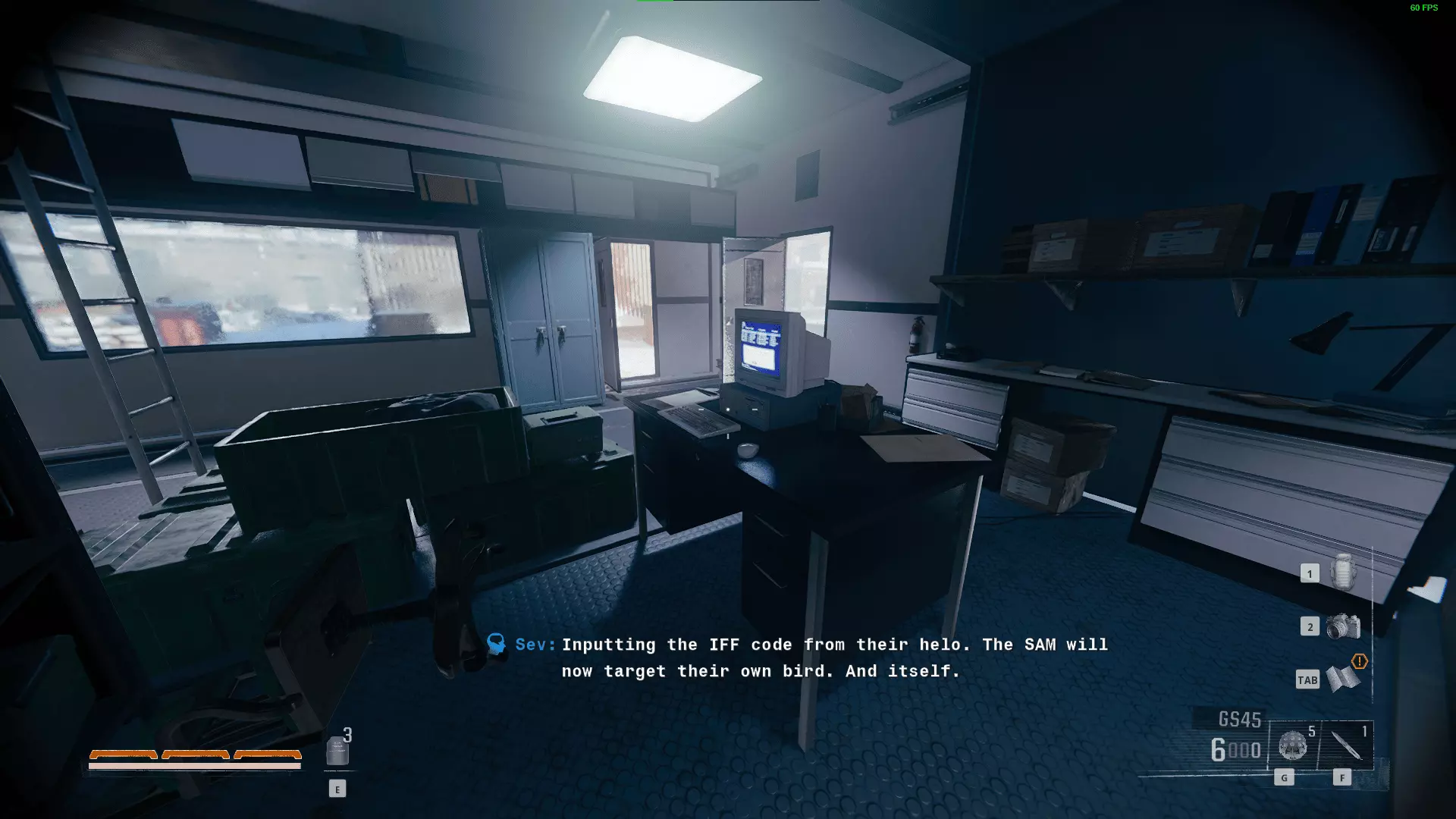 在《秘密潜入》中,让地对空导弹(SAM)锁定自身和直升机。控制角色前往主基地后,找到弹头区域中间办公桌的守卫并将其击晕,然后把他放进储物柜。入侵电脑并输入以下代码:ORION >> TARGET >> (入侵地对空导弹发射阵地) >> ICARUS >> CODE