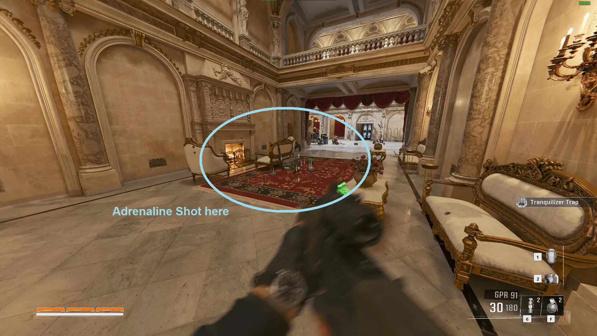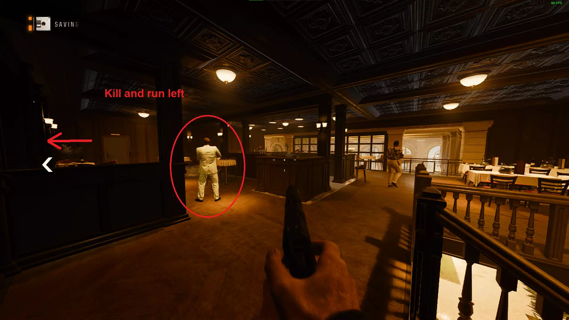 第二次机会:在任务接近尾声时,主宴会厅会出现第二次机会。当你进入西翼后,准备好飞刀并将其扔向舞台方向。瞄准下方房间中央的4名敌人。