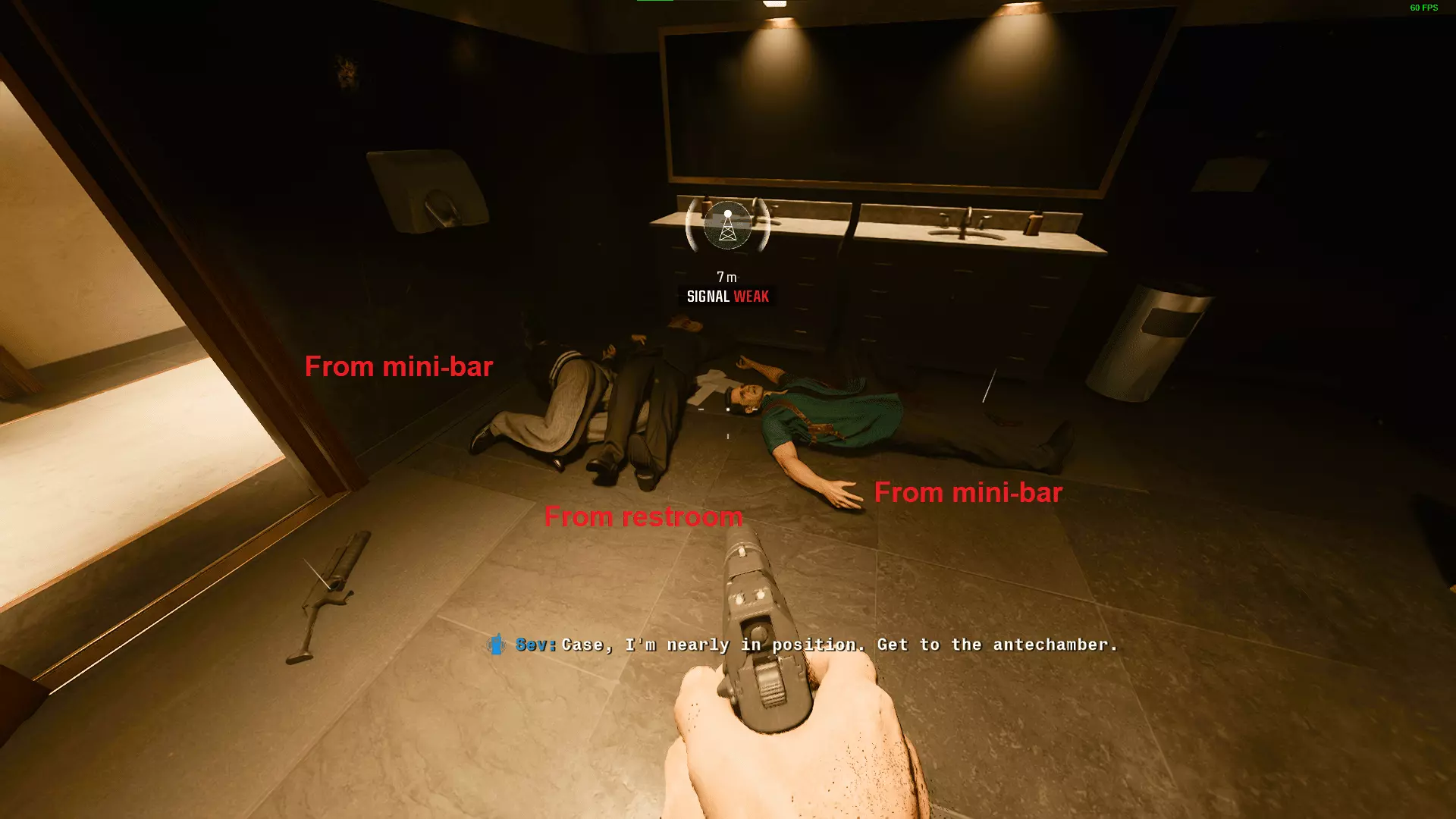 通过制造声响或让剩余的2名守卫看到你并产生怀疑,将他们引诱至洗手间。等他们靠近后将其击杀。然后蹲下保持安静,前往楼梯。在楼梯顶部,等待左侧守卫转身、右侧守卫走开后,击杀左侧守卫,再穿过左侧的门。达成成就Poof。
