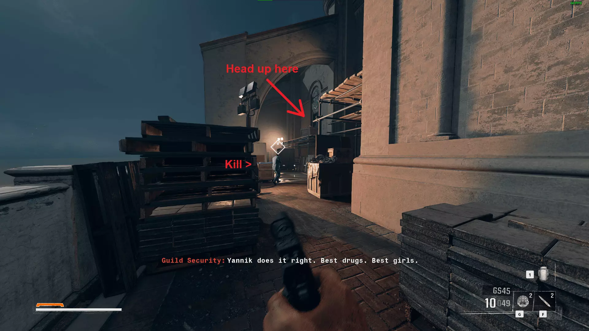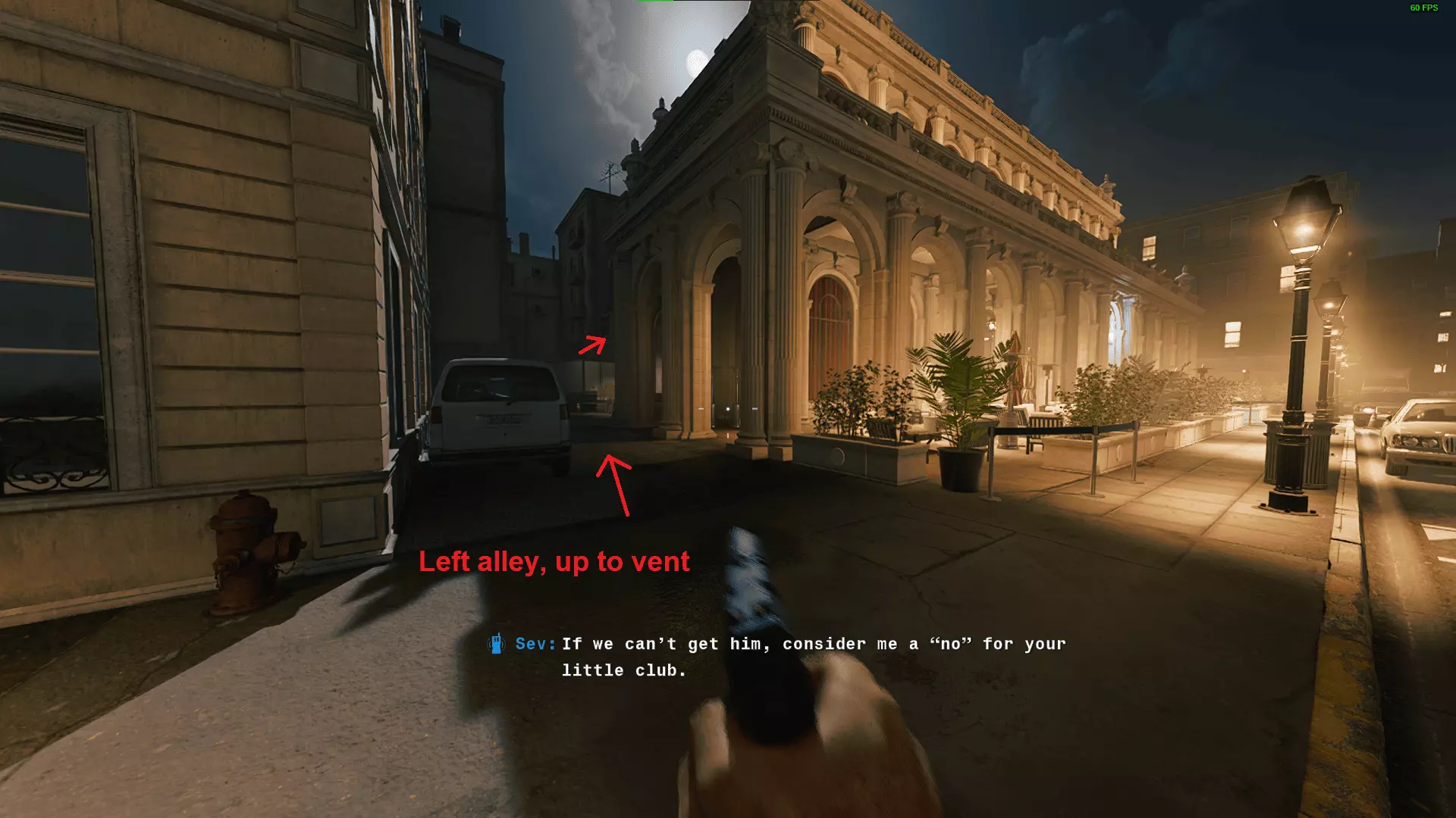 一旦你爬上钟楼并狙杀了游艇上的扬尼克,就从钟楼跳入下方的水中。然后沿着我们前往钟楼的相同路线返回起始区域。短暂过场动画后,通过左侧小巷进入餐厅,接着向左进入通风管道,并解决洗手间里的守卫。