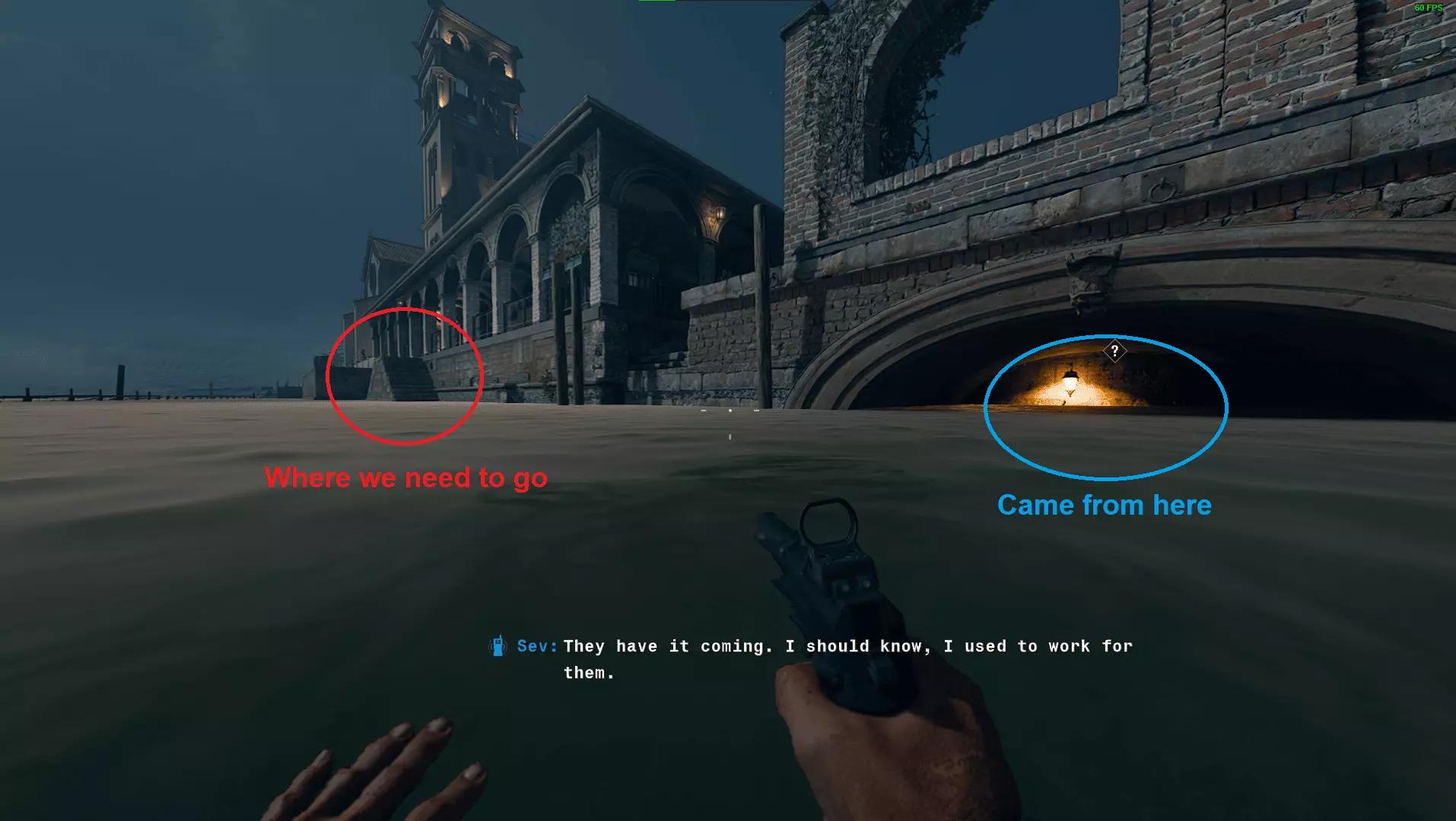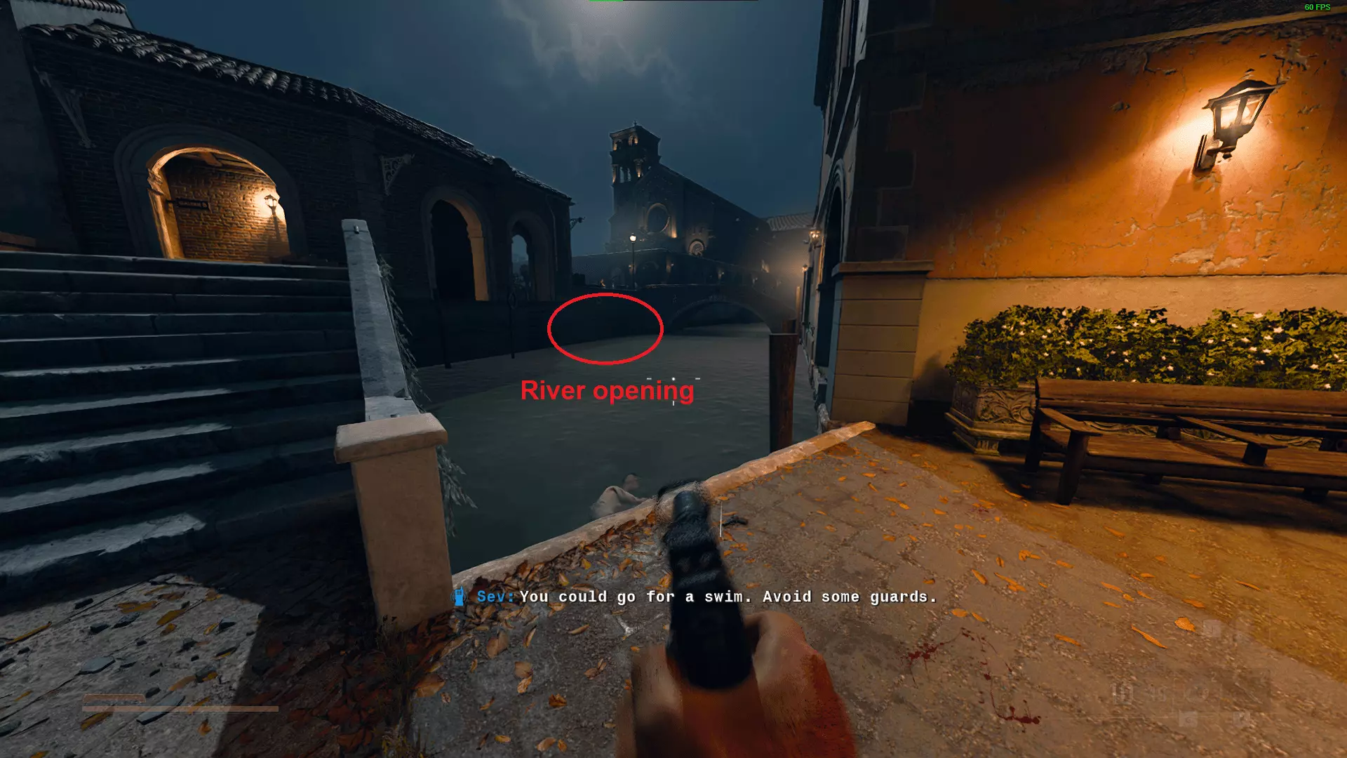 在《血仇》中,全程不打破潜行状态抵达公会会议。任务开始时,解决河边的守卫,然后前往左侧的河口。游过隧道,出来后向右转,朝着一些楼梯前进。