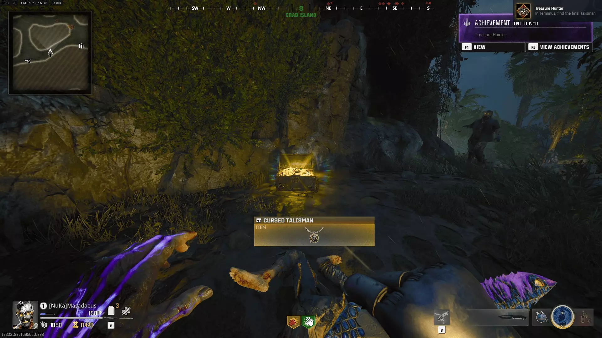集齐3枚硬币后,返回海洞船长处并将硬币交给他。接下来你需要在螃蟹岛生存3回合,因此请在获得合适的装备后前往那里,坚持生存直到岛屿后方刷新出宝箱。该区域的闪电会受你的进度影响,闪电越多,你就离获得诅咒护符越近。生存下来后,前往宝箱处打开它即可解锁成就。