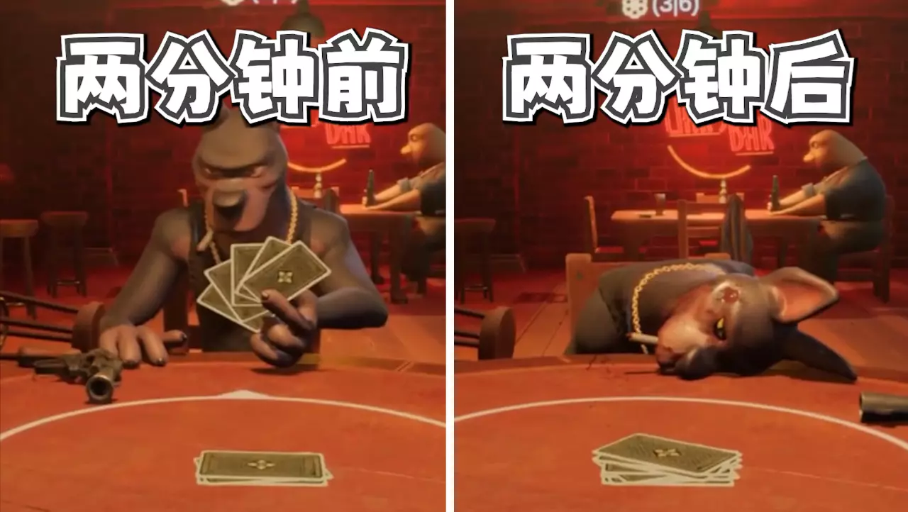 这是游戏《骗子酒馆》的趣味对局内容,展示对局进入终局,剩余最后两名玩家均为5/6状态,在两人互相开枪对决后,最终结局为无人生还,对局直接平局。