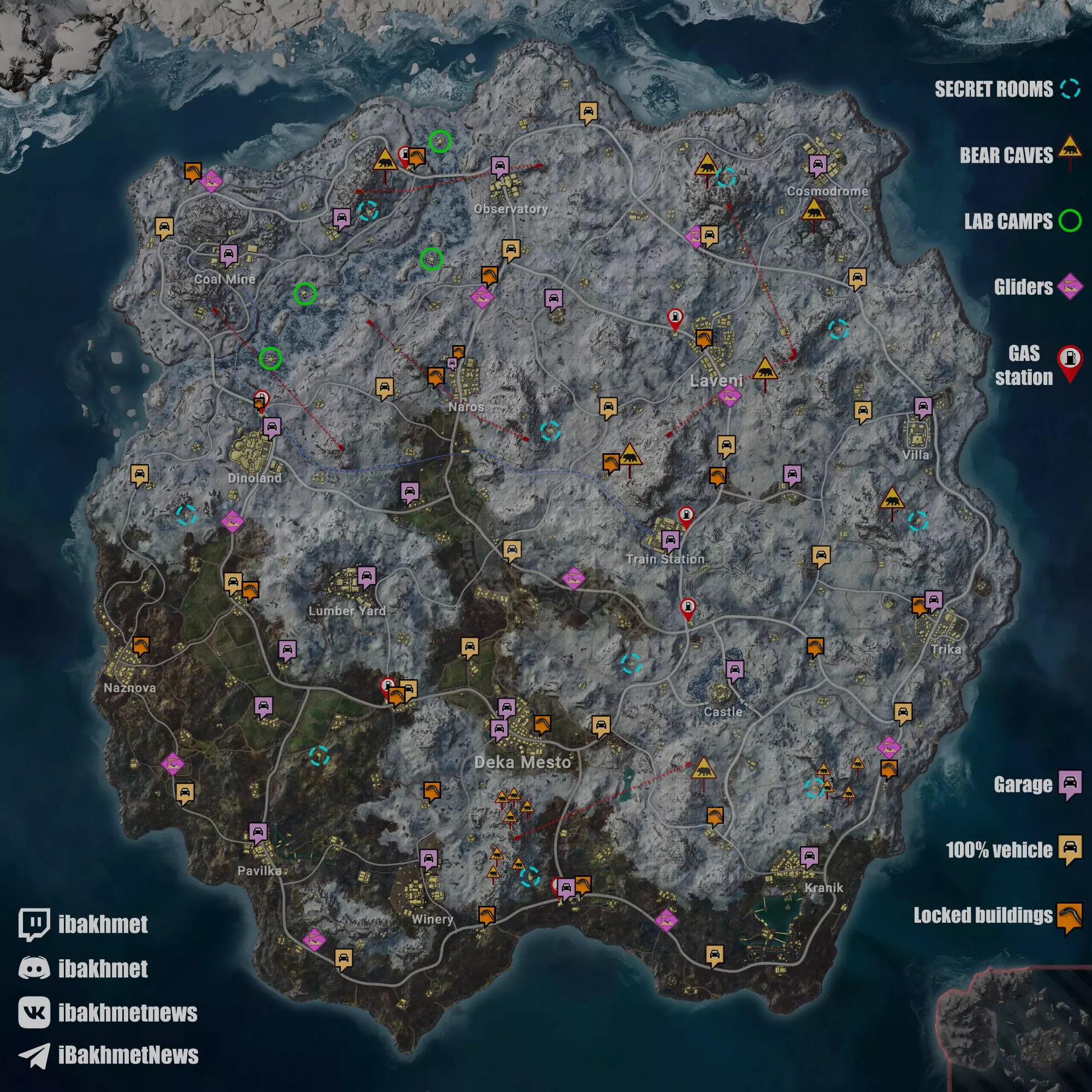 100%载具及滑翔机刷新点。加油站、车库、秘密房间(需钥匙卡)、上锁建筑(需撬棍)、实验室营地以及熊洞位置。全尺寸地图[ibb.co] 狄斯顿 | 安全钥匙 重要提示!你可以打开支柱拖车和房间。这是地图的过时版本(无人机从游戏中移除后,窗户、通风口、集装箱等不再可进入)。