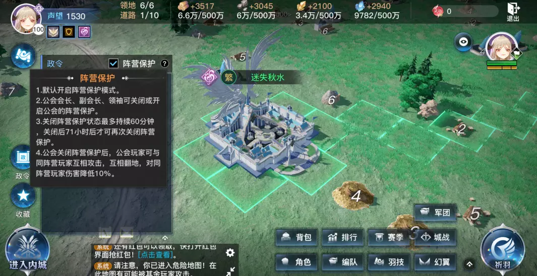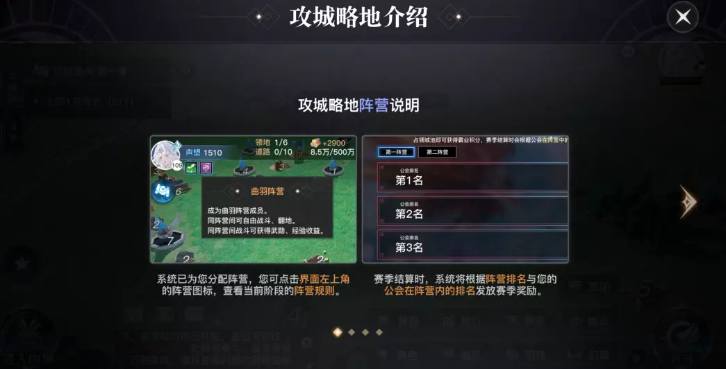 “阵营保护模式”默认开启,同阵营和谐共处,一致对外。想要进行策略变阵时,公会会长/副会长/领袖可在【政令】中,选择临时关闭阵营保护。