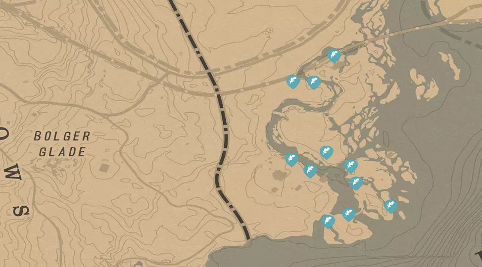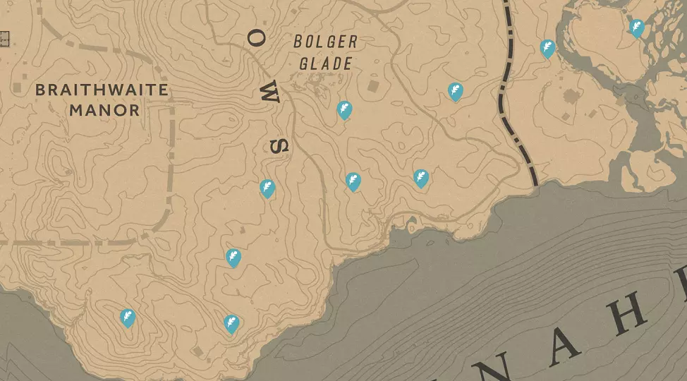 黑莓 黑莓很容易通过锯齿状的叶子和黑色的聚合果来识别。黑莓灌木丛能在贫瘠的土壤中生长,因此在林地、树篱和山坡上生长得很好。这种植物常见于西伊丽莎白地区,也生长在达科他河沿岸。食用黑莓可以恢复生命值,也可用于制作捕食者诱饵。可以制作强大的捕食者诱饵。