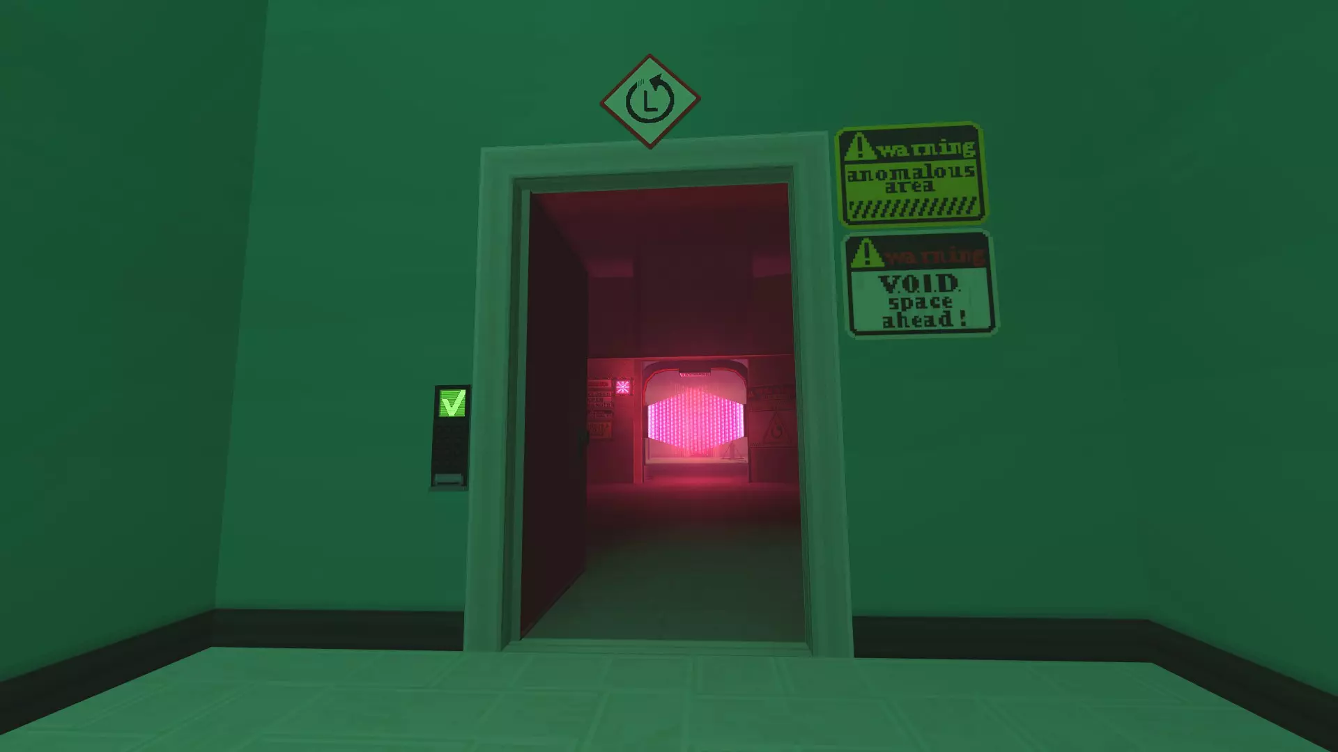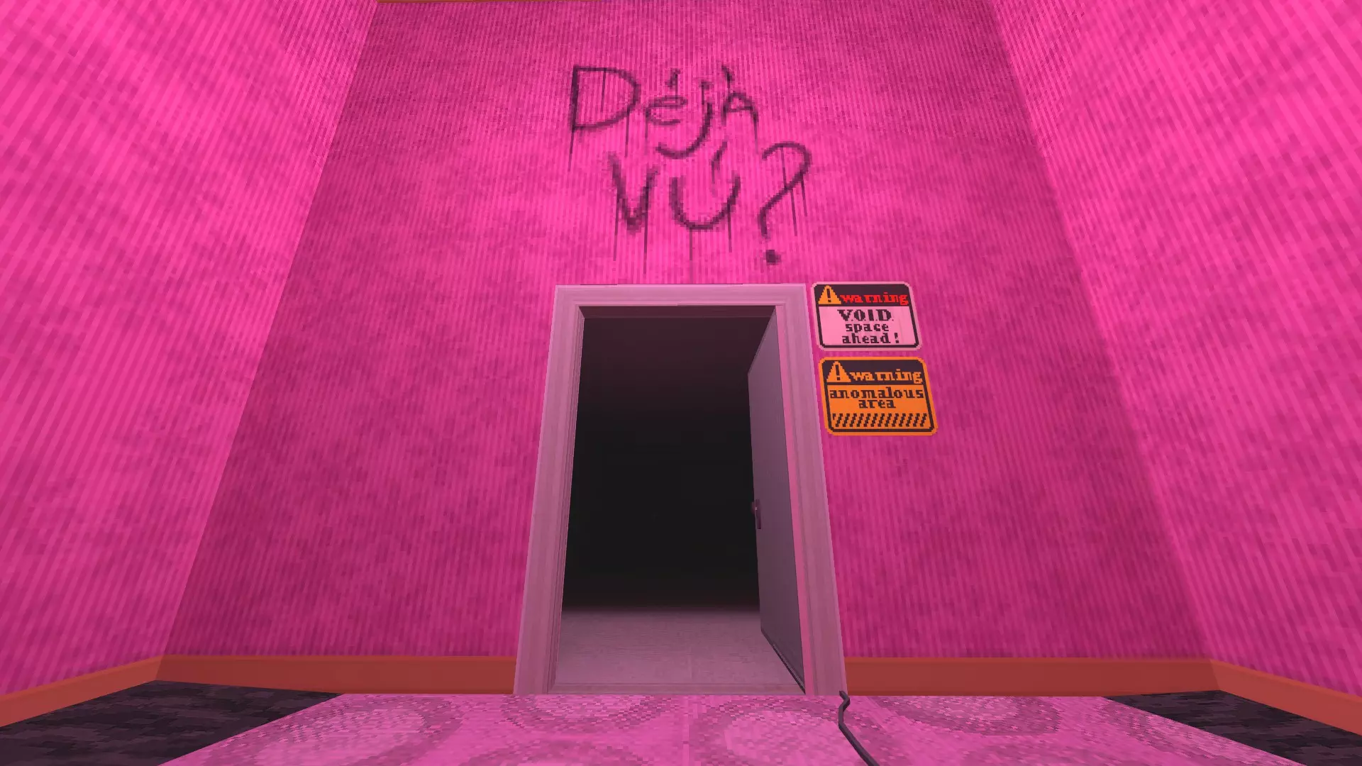 地图剧透//这扇门通往白色建筑群。上面就写着呢! 似曾相识? 不过,如果你想往回走而不是向前,UComplex还有另一个出口。 穿过接待区后,会有一条绿色照明、木地板的走廊,沿着它走会到达一个类似起居室或公共区域的地方。右侧一扇棕色门后是一个带壁炉的休息室。你可以先欣赏一下景色,然后走向一面玻璃墙,进入墙后的房间,你会发现自己身处一个带有粉色花纹壁纸的房间。你面前的门上写着“DEJA VU?”。