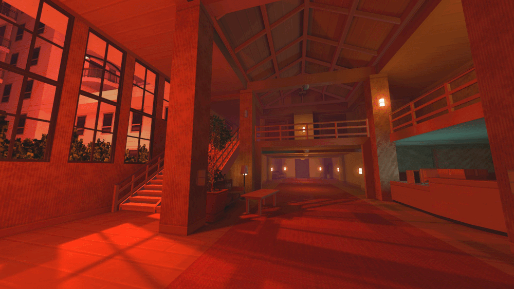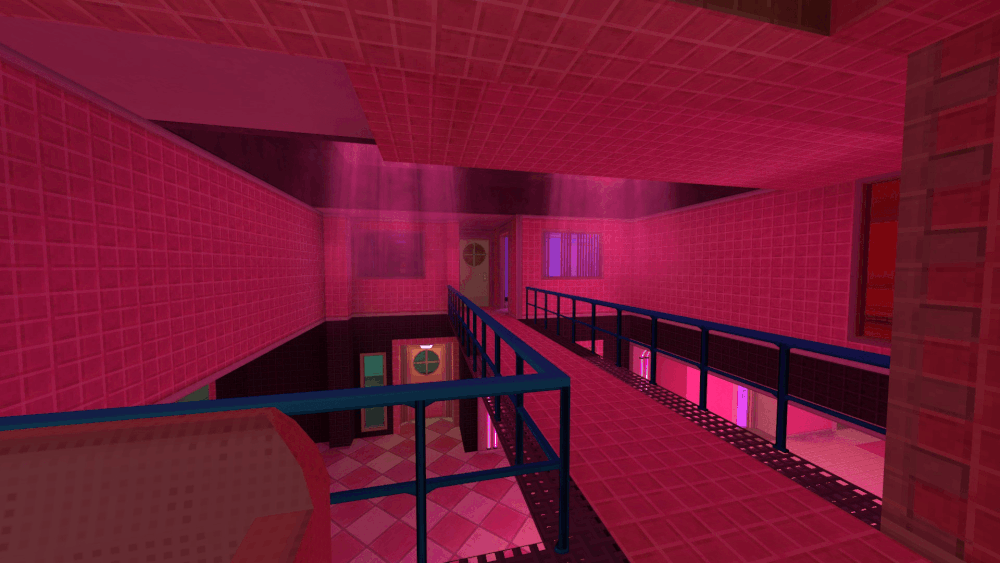 回到房间后,穿过另一扇生锈的门,进入红色的酒店走廊区域。沿着走廊走到尽头,会进入一个类似大堂的区域。沿着左侧的楼梯上到二楼,然后一直走到走廊尽头,直到看到一组金属楼梯。转身进入上方有“出口”标志的生锈金属门。 上楼梯直到抵达一个带铁笼的门框,然后向右转穿过生锈的门,向前穿过黑色的门,接着走左侧的楼梯下楼。穿过生锈的门,然后再次下楼。最后,穿过两组黑色双开门,从栏杆损坏的区域跳下,转身穿过黑色门,然后沿着走廊继续前进,到达最后一组黑色门。 拿到两张钥匙卡后,使用终端机,然后从右侧的铁笼门出去。地图加载完成后,你就可以继续前往下一张地图了! 地图剧透//这扇门通向……某个地方。我们目前还不清楚! VP_PinkPlace
