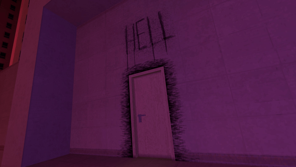 你就那么想离开吗?一个荒凉、寂静的地方。狂风呼啸,诡异的雾气萦绕在看似无尽的深坑周围。天空与地面交相辉映,深坑循环往复,大门紧锁。这里就是终点。跳下去,或者跑起来。没有逃脱的可能。真的没有吗? 粉红地狱 无论你是如何来到“另一面”的,选择坠入下方的水池,你会看到一扇非常显眼的标有“HELL”的门。进入探索,你会遇到一台照亮走廊的电视,关掉它会导致外面传来一声巨响。回到水池边,你会发现墙上出现了一个新的入口。 进入入口,跟着箭头走。不要偏离路径。不要偏离路径。不要偏