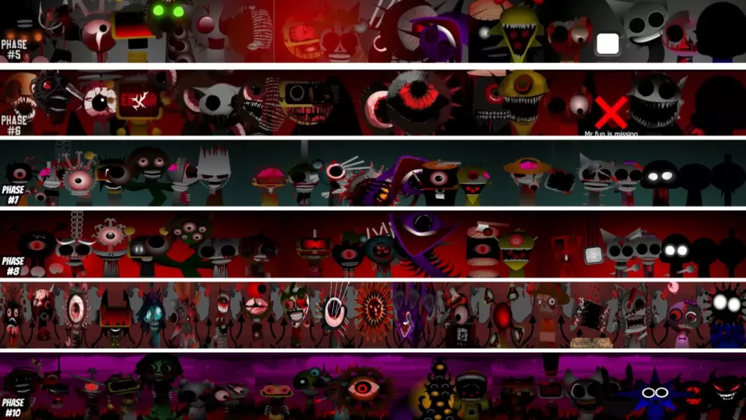 这组图片展示了Incredibox Sprunki Mix里Phase 5和Phase 6的角色形象对比,Phase 6的角色形象相比Phase 5风格更暗黑怪异,呈现出明显的形象进化差异。