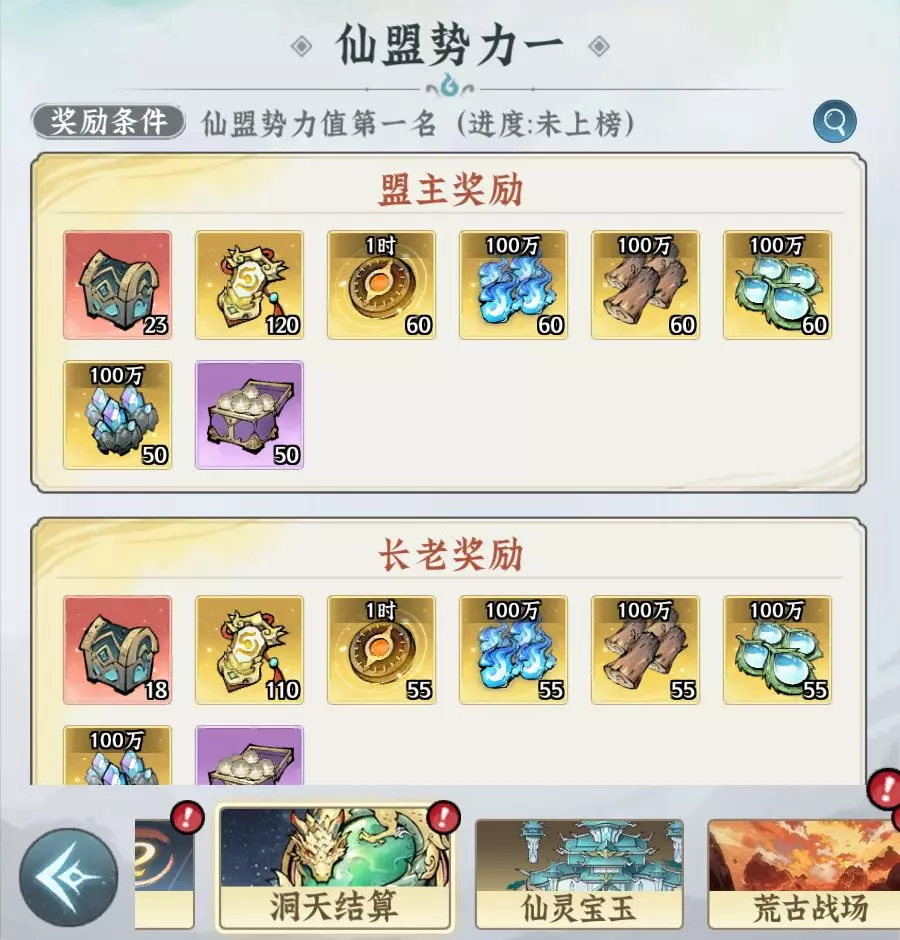 洞天结算奖励按仙盟势力值划分,共分为第1名、第2-3名、第4-10名、第11-20名、第21-100名五个档位。所有档位奖励内容基本一样,但档位越高数量越多。同时,处于前三个档位的仙盟会额外获得一份高级炼丹宝箱的奖励。