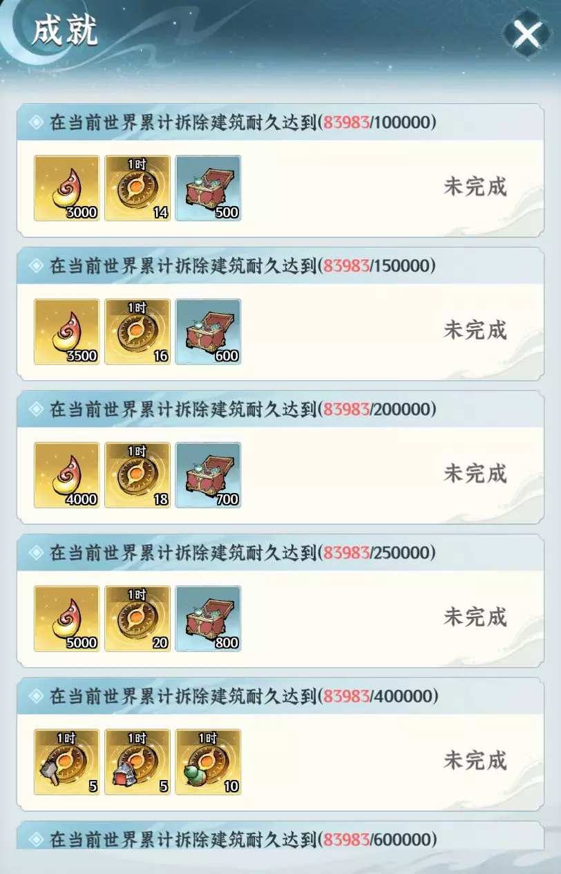 同时,通过参与洞天竞赛,按照在当前世界累计拆除建筑耐久值,还可获取对应的成就奖励。包含灵石、通用加速与资源自选箱等。