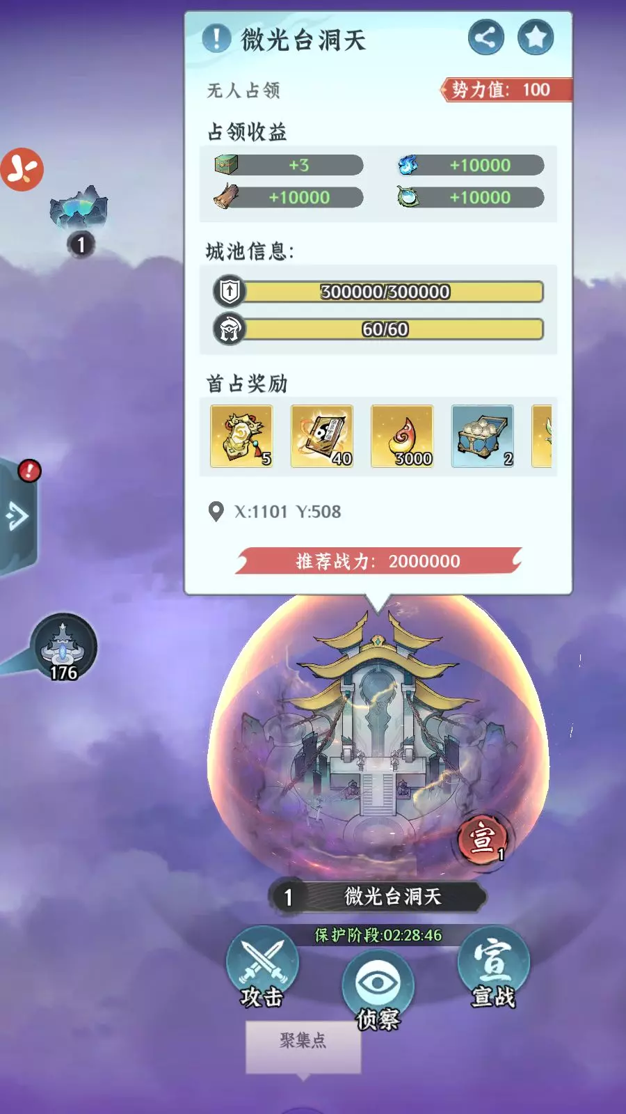 势力值:洞天等级越高,可提供的势力值、首占奖励越多,同时攻打难度也会越高。