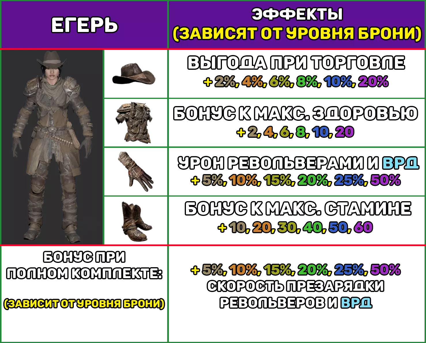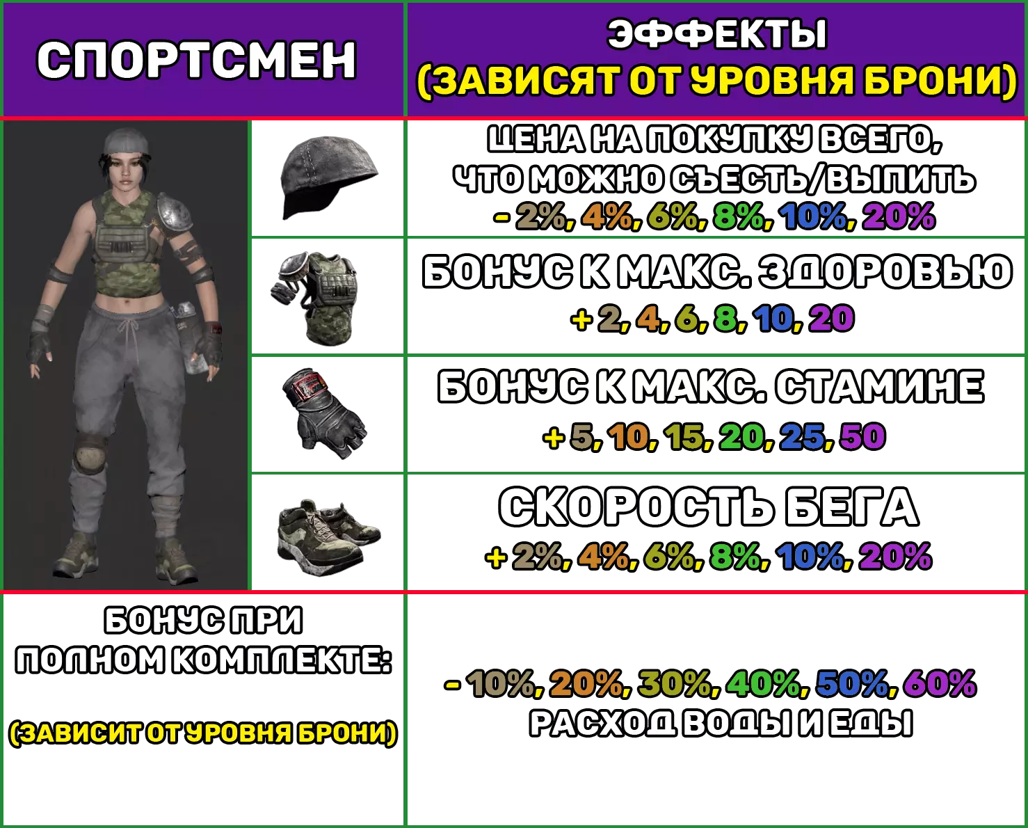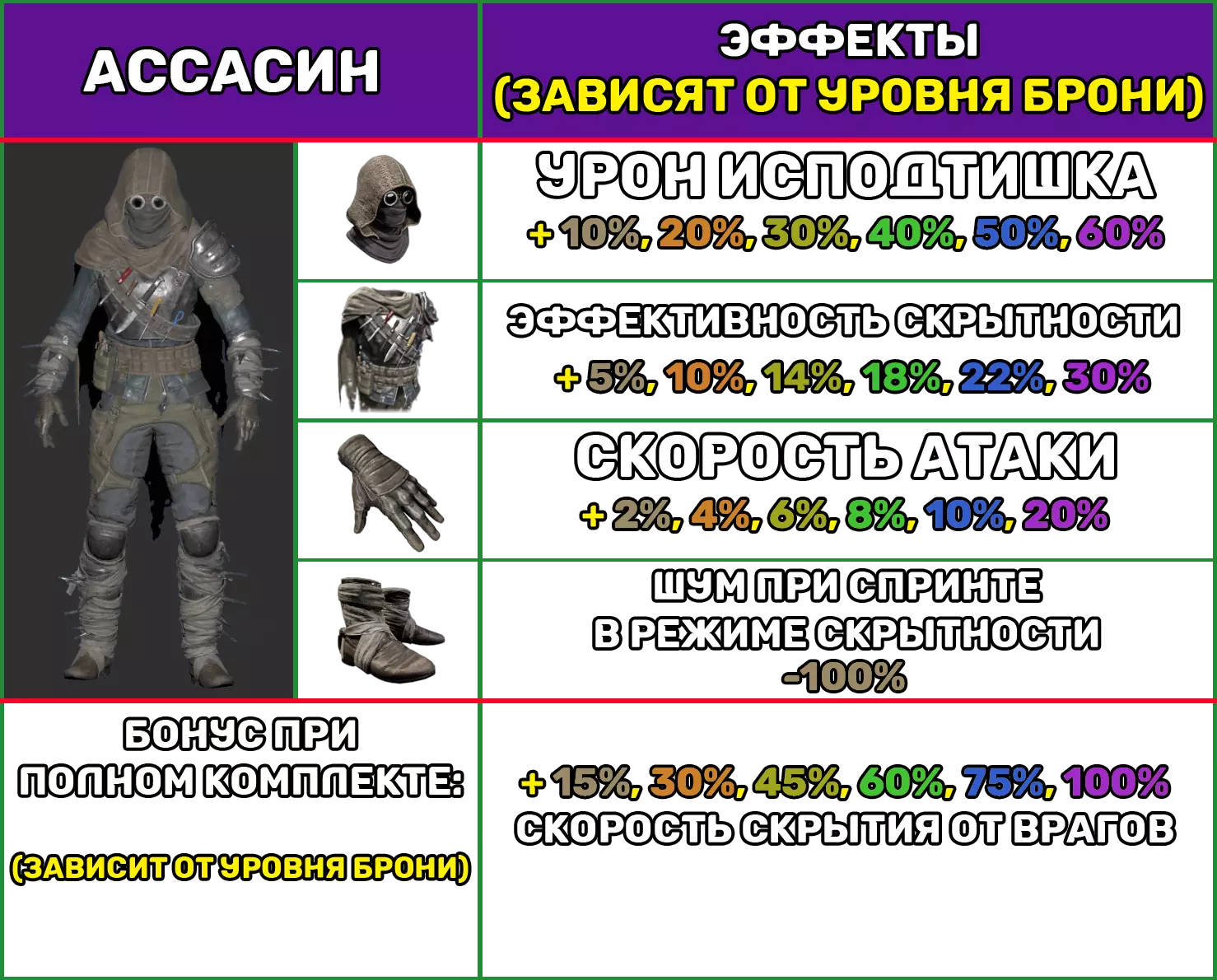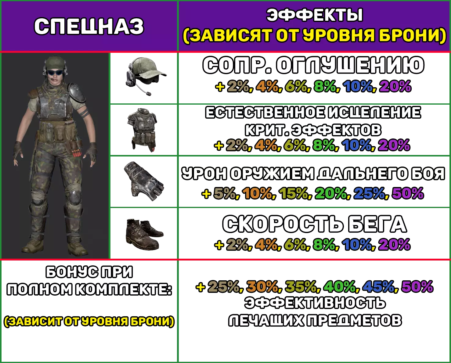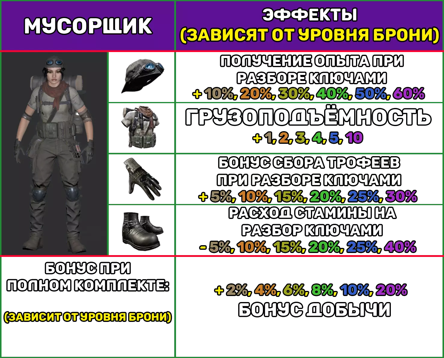 平均护甲 1个护甲部件具有以下特性: 护甲等级 1 2 3 4 5 6 防护百分比(±0.2) 12.9 13.8 14.8 15.5 16.3 17.2 耐久度/秒 -0.56 机动性 -5% 噪音增强 +10% 制作 制作任意中型护甲套装的一个部件所需材料: 护甲等级 护甲套件 皮革 铁锭 钢锭 传奇部件 1 1 5 2 2 10 3 3 15 5 4 4 20 10 5 5 25 25 10 6 6 25 25 25 1 注意: 1. “刺客”护甲套装无噪音增强惩罚。 2. 杠杆式步枪(ВРД).