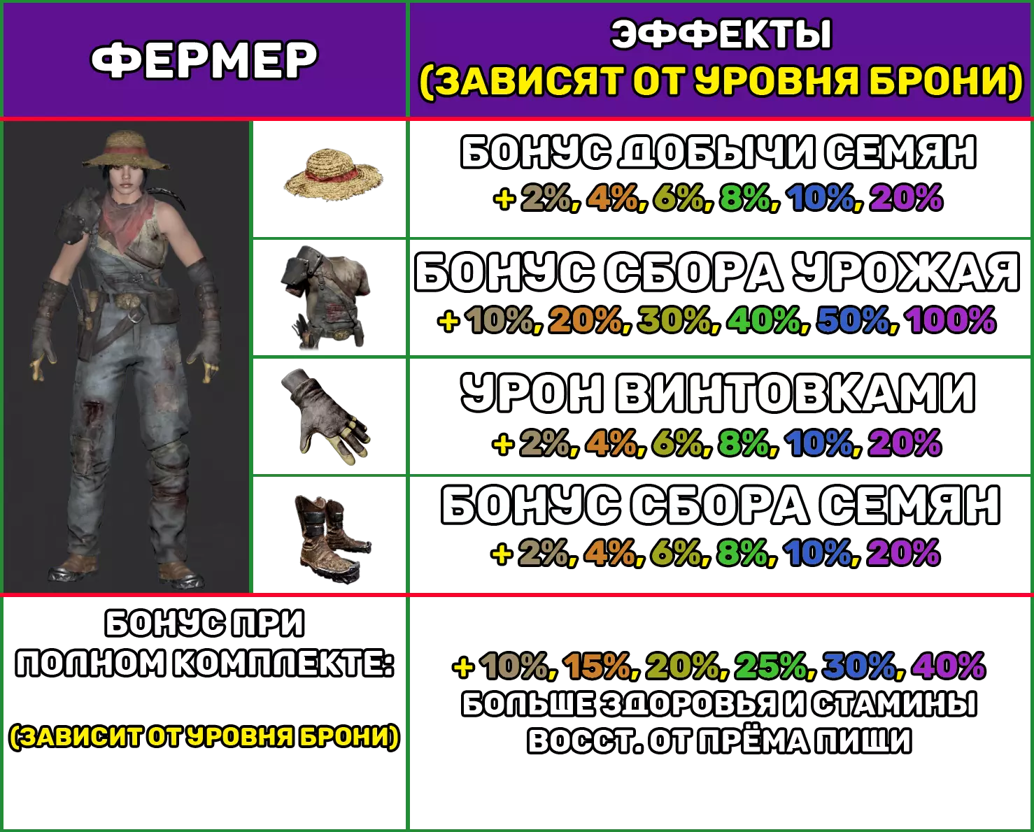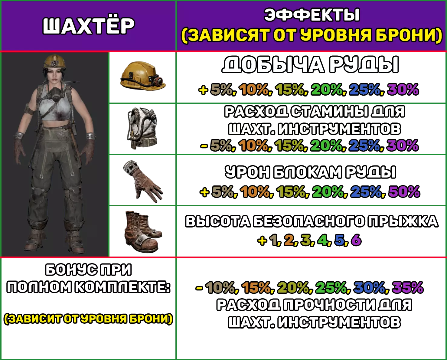 本指南包含版本2.5发布时所有现有装甲套装的信息 关键信息 注意: “简易装甲”是唯一没有加成的套装,因此不会出现在列表中。那么,游戏中共有15套带有加成的盔甲,其中包括: — 5套轻型盔甲; — 6套中型盔甲; — 4套重型盔甲; 每套盔甲由4个部件组成:头盔、服装、手套、靴子。每个部件都有其独特的效果。 穿戴同一套装的4个部件可获得特殊加成。 所有效果和加成均取决于盔甲等级。套装奖励将根据所装备护甲的最低等级来计算。也就是说,如果您有3件4级护甲和1件2级护甲,那么您将获得2级的奖励。 轻型护甲 1件护甲具有以下特性: 护甲等级 1 2 3 4 5 6 防护百分比(±0.2) 7.9 8.8 9.8 10.5 11.3 12.### 制作 制作任意一套轻型盔甲的一个部件所需材料: 盔甲等级 盔甲套件 布料 铁锭 钢锭 传奇部件 1 1 5 2 2 10 3 3 15 5 4 4 20 10 5 5 25 25 10 6 6 25 25 25 1 季节限定物品(冬季): 圣诞帽 效果