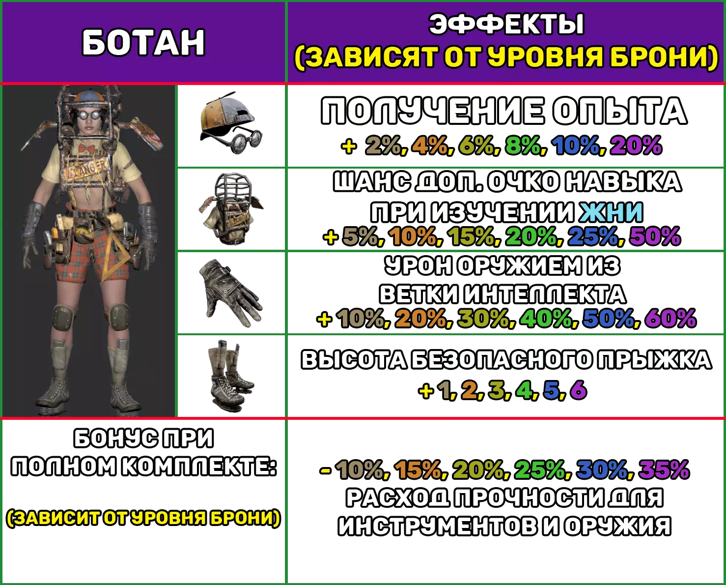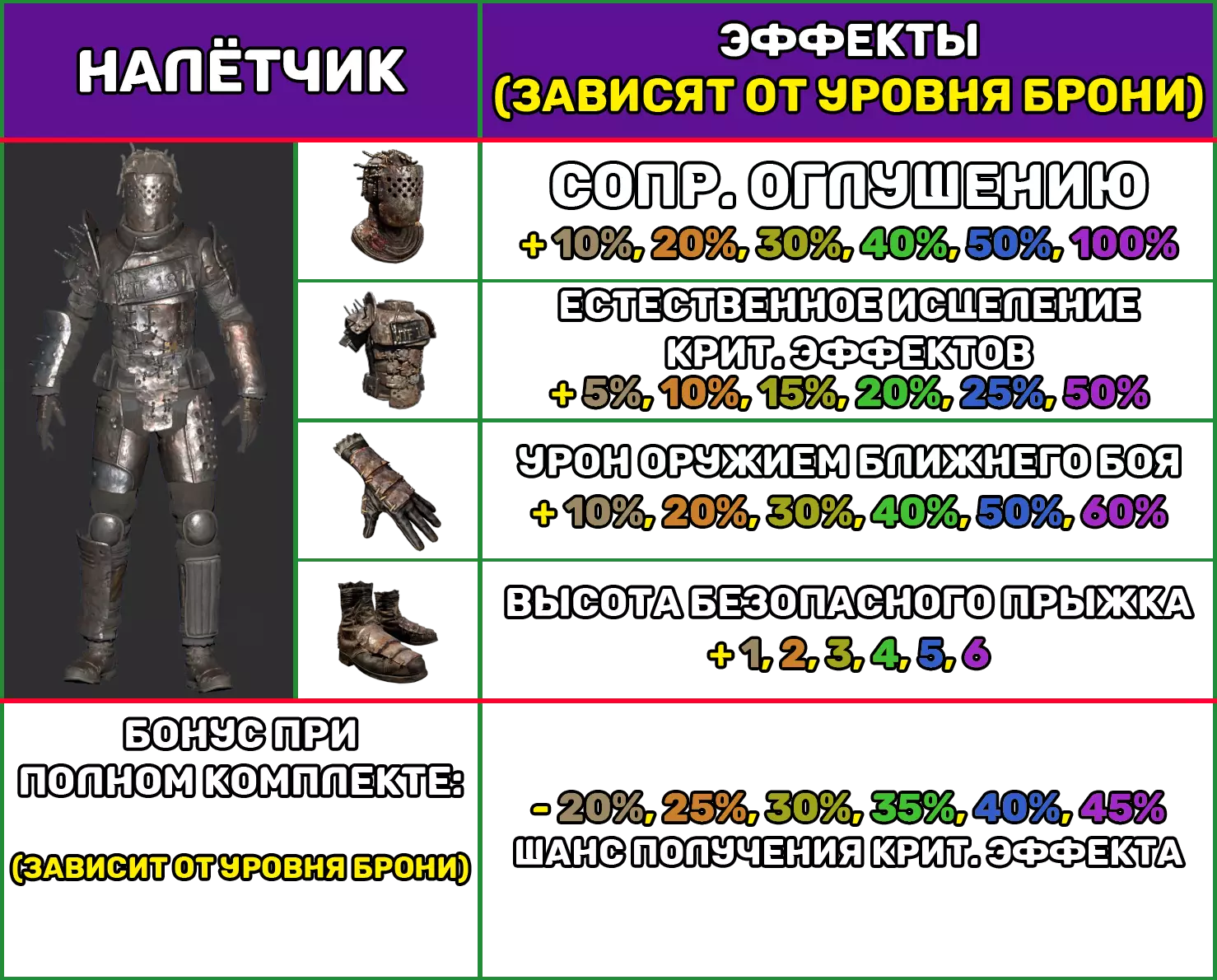 重型装甲 1个装甲部件具有以下特性: 装甲等级 1 2 3 4 5 6 防护百分比(±0.2) 17.9 18.6 19.3 19.8 20.2 20.9 耐力/秒 -0.移动性 -8% 噪音增强 +20% 制作 制作任意一套重型护甲的一个部件所需材料: 护甲等级 护甲套件 皮革 铁锭 钢锭 传奇部件 1 1 5 2 2 10 3 3 15 5 4 4 20 10 5 5 25 25 10 6 6 25 25 25 1 备注:ЖНИ - 制作技能日志。