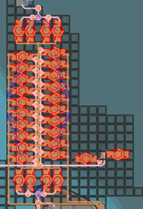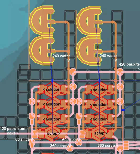 这展示了上述比例的两倍平铺(因为一条5级传送带可承载360×2的铝废料输出)。只要铝土矿和石油焦管道有足够的并行空间为整个系统供料,它就可以无限期地进一步平铺。 基本思路是构建一个由3座氧化铝溶液精炼厂组成的循环,它们接收240单位水和210单位铝土矿,将溶液排入一座反向放置、高出8米的铝废料精炼厂。 8米的高度差很重要,这能让铝废料处理过程中产生的废水优先于从另一方向流入的240单位新鲜水(尽管从数学角度看本不应出现溢流,但长时间运行后仍会发生)。8米也仍在溶液精炼厂的固有扬程范围内,因此整个系统无需额外的泵操作即可运行,尤其是当溶液精炼厂基本位于海平面时,也不需要从水提取器引出泵。重要的是,废料精炼厂的废水应沿与提取器相反的方向输送给溶液精炼厂,以减少可能出现的管道吞吐量和 junction priority 相关问题。在此设置中,输入的石油焦管道在废料精炼厂下方运行。(既然下面有空间,为什么不用呢)