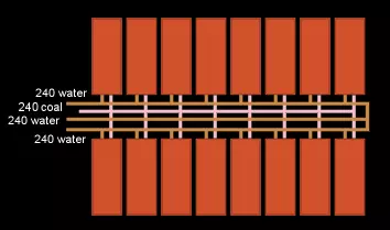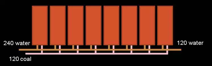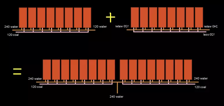 通过这种方式,我们现在拥有一个包含3个独立240单位水输入的系统,每个输入只需连接2个萃取器。最后一步,我们将此布局折叠,形成两排相对的结构,这样所有水源都来自同一方向,煤炭传送带也能合并,通过共享分流器进一步减少组件数量。