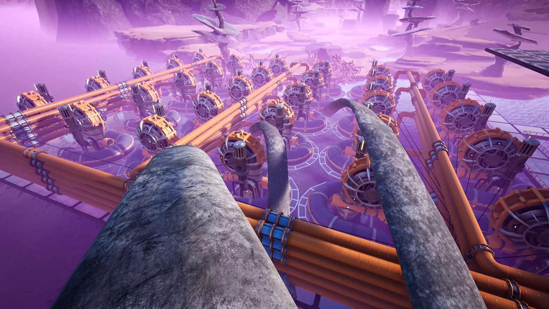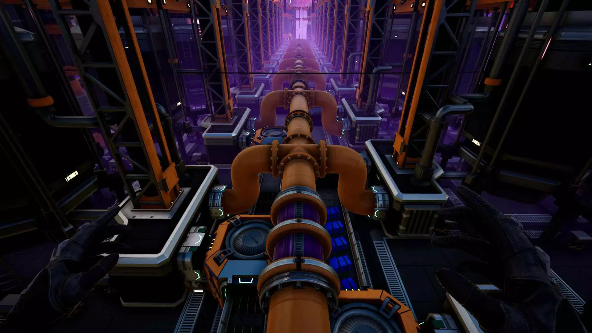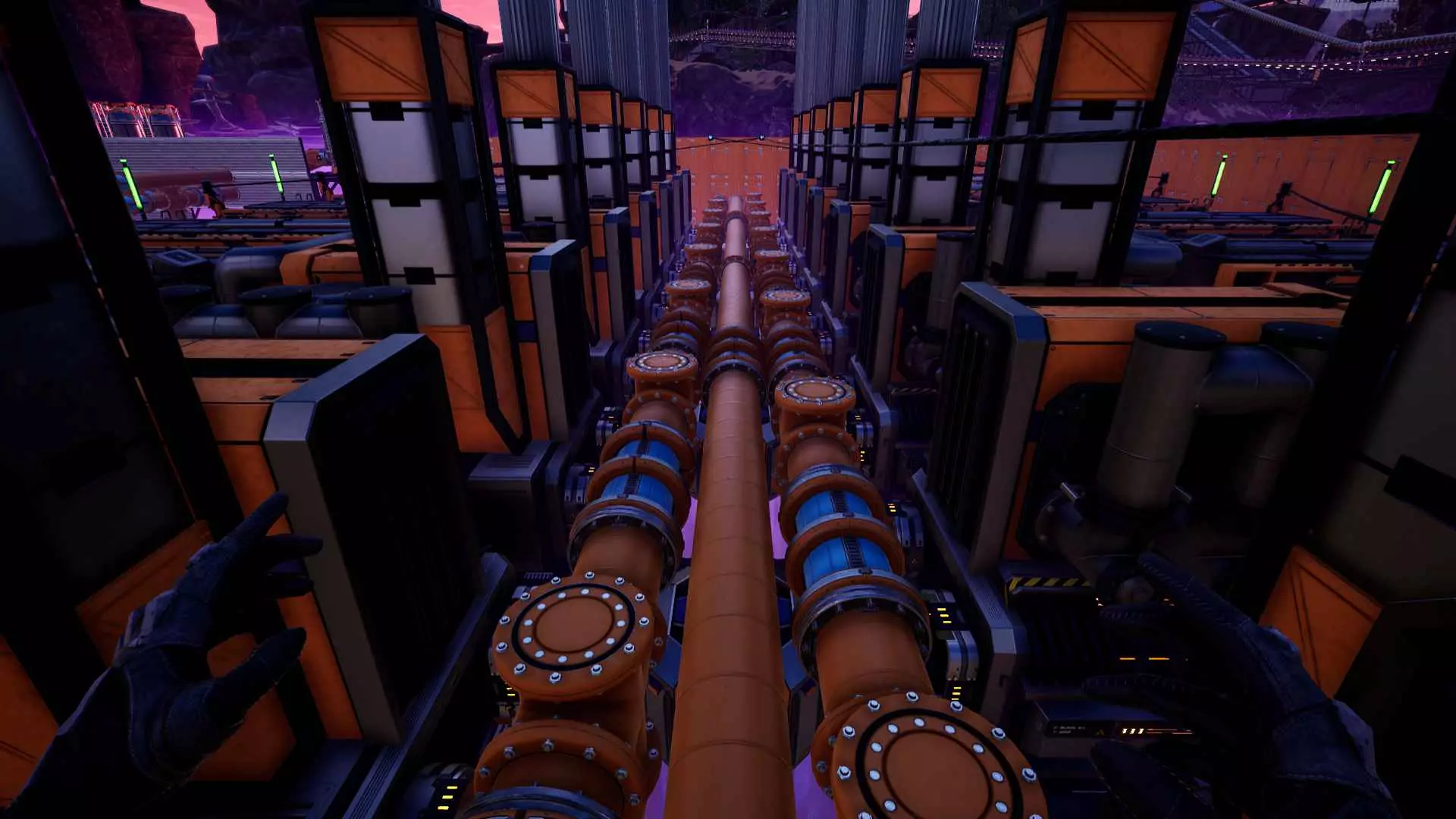 你可以在墙上放置管道连接口。这样能确保它们在垂直和水平方向上都处于网格对齐状态。与传送带和管道的墙面安装方式类似,管道连接口的中心会距离墙面2米。搭建临时墙壁作为“脚手架”,然后铺设一整排连接口,是快速将管道按网格布局架设离地的方法。