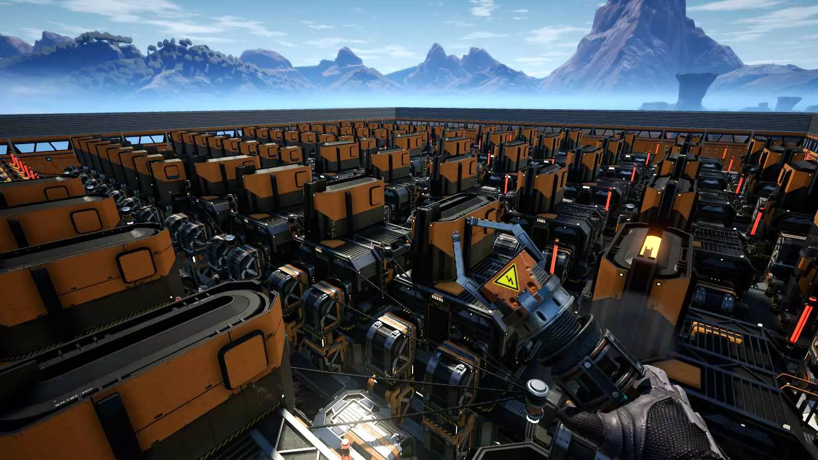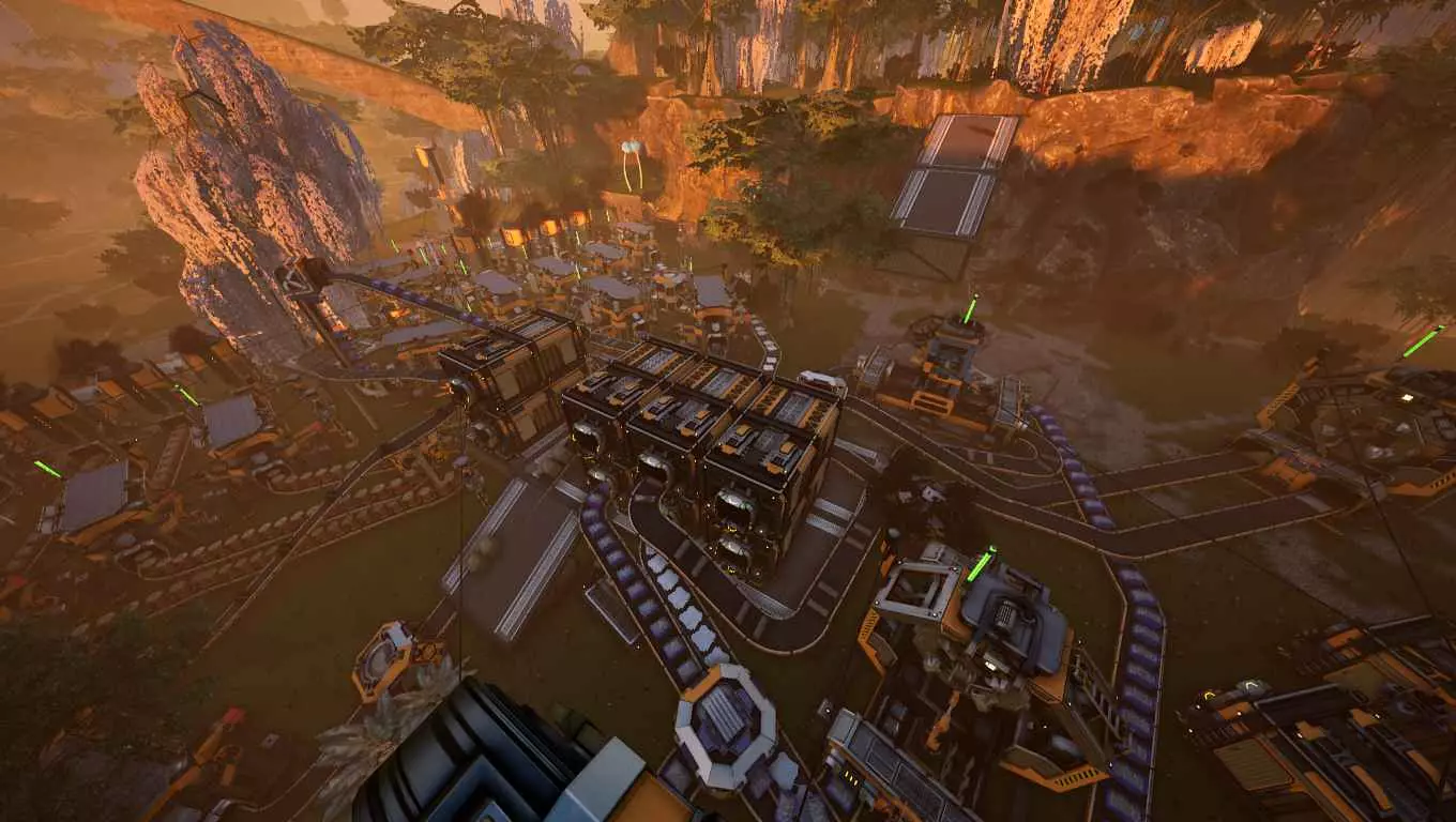 这建筑真不错……里面却连一台机器都没有,呵。 通常我的多层“主基地”建筑有21x19的地基,它坐落在一个更大的41x41地基正方形之上,这额外的空间足够在外面放置火车站、临时的机器排等设施。把这一切都建好很繁琐(而且需要大量混凝土,最好在游戏早期就确保有稳定的混凝土供应!),但非常值得,这样在游戏后期建立专门的零件前哨站之前,就再也不用担心基地空间问题了。 (待办事项:提供详细的主基地布局参考以及往返物资中心的路线规划) 至少对我来说,拥有规整的结构能让游戏一目了然。那些形状不规则、相互投下阴影的建筑,以及非直角的传送带/线缆等,会让游戏变得难以理解。这会造成不必要的视觉混乱。不妨对比一下这个更新2的截图(在超级管道和墙壁支柱出现之前)与更新3的截图,暂不考虑着色器的改进。