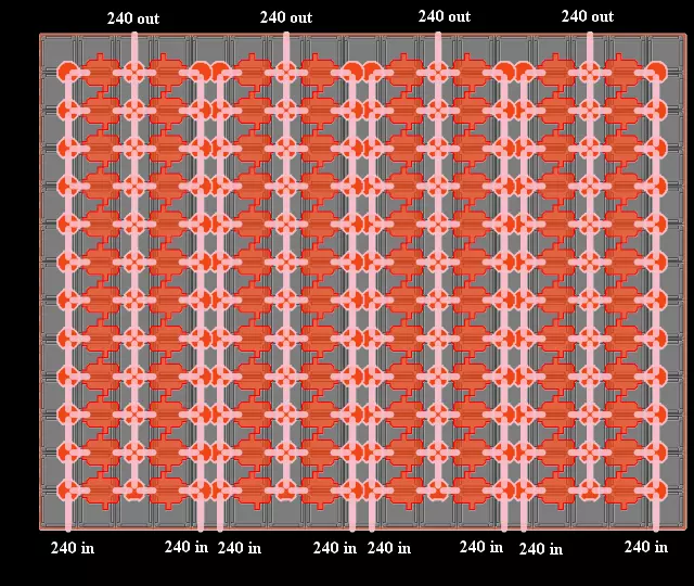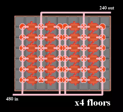 如果我想减小上述布局的占地面积,可以设置4层,每层4排共6个建造器,并预先建造一个高12个8x8x4地基、长7个地基、宽9个地基的建筑。(480的输入量确实假设使用了比前一个示例更快的传送带)