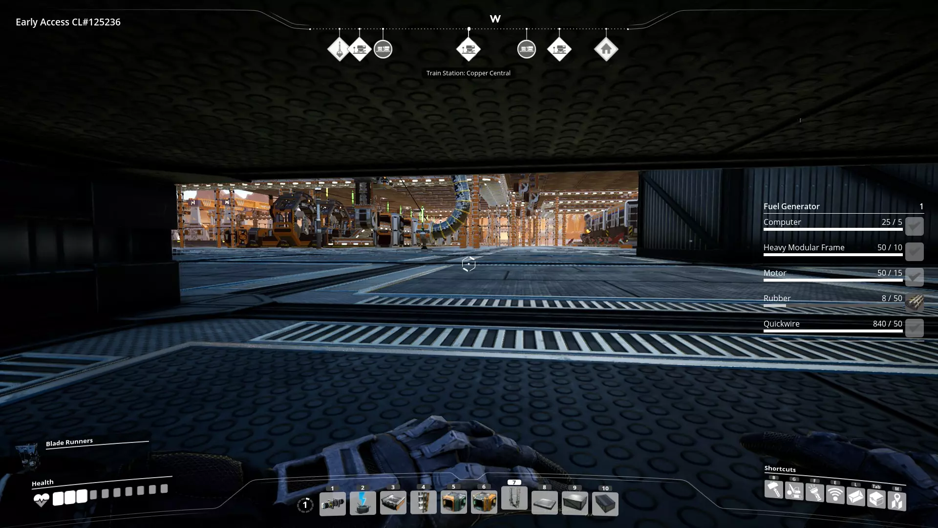 游戏中的零件种类非常多,因此规划物资中心的规模和零件分配可能会很繁琐。我通常使用6组7个工业存储仓(待办事项:添加确切布局作为参考),这能满足我所有的需求,其中一些存储仓还为空,可用于未来的内容。将这些存储阵列的末端换成堆叠的存储容器,可以增加物资中心内不同零件的数量(例如,我认为我永远不需要让两条传送带的涡轮电机或重型模块化框架进入一个工业存储仓,也永远不需要一次性使用一个工业存储仓容量的这些零件,所以这永远不会成为瓶颈问题)。锭可以放心地排除在物资中心的考虑范围之外。不仅用于手工制作的锭获取时机极为稀少,而且出于帧率考虑,基础的锭→板材/棒材/梁/管道/薄板/线材生产在前期就应尽早从主要起始建筑移至远处,尤其是在解锁火车之后。 (目前来看?)所有危险物品都应放置在远离主工厂区的独立位置,原因显而易见。 一个良好的基地布局应能让各部件生产线在将部分产出输送至工厂区的同时,也能便捷地将部件送往其他所需地点。我每次游玩时通常都使用相同的配置,所以对所有物品的位置都了如指掌,但如果在玩家视角的基地区域能看到一小段入口或出口传送带,就能快速直观地分辨出各个容器里存放的物品,这确实很有帮助。