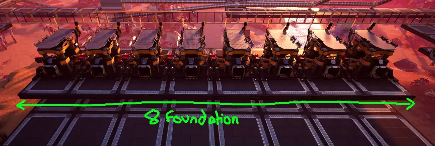 8个熔炉排成一排(6个地基长)是一个很好的基础单元,有助于快速建造,因为这符合游戏早期和中期的输入输出比例。即使长度为9米,熔炉也能放置在高架的地基排上。