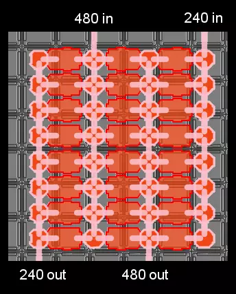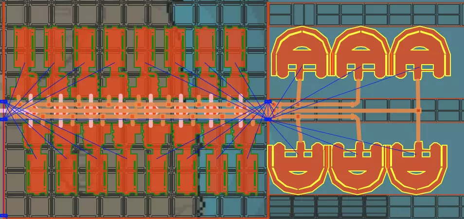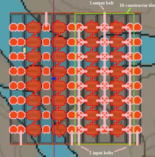 由于许多配方的输入每分钟零件数通常大于输出,或者反之,理想的布局往往是用2条输入传送带,为2排相对放置的建造器供料,这些建造器再将产物汇入1条输出传送带。这种布局仍能与传送带墙的开口整齐对齐。在此布局中,建造器在输入/输出两侧与分流器/合流器紧密贴合,同时保持其沿长度方向的边界居中对齐。