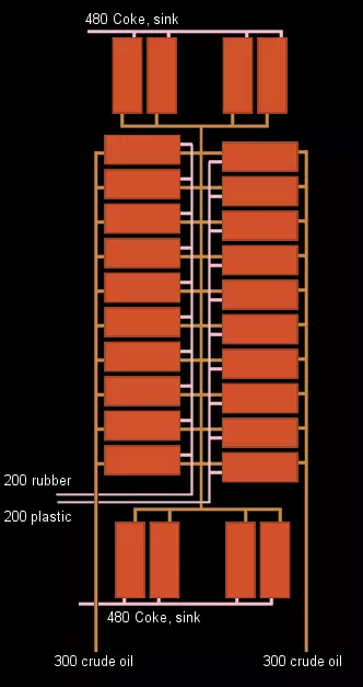 以下是初期可能的运作方式:使用四座精炼厂。随着对橡胶或塑料需求的增长,可在塑料和橡胶生产线增加精炼厂,同时确保有足够数量的对应焦炭精炼厂(以及相应的废品处理设施!)来处理副产品。