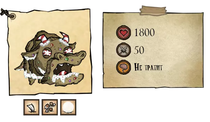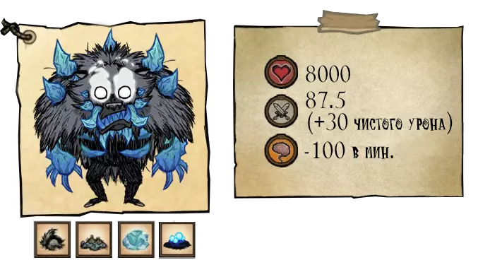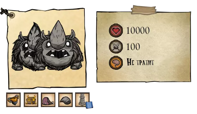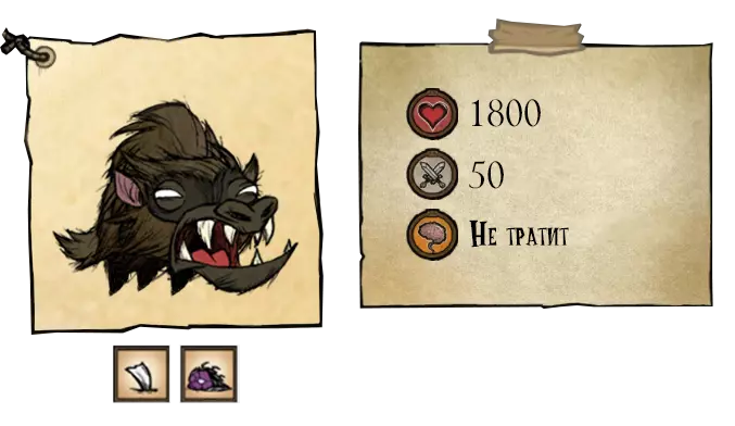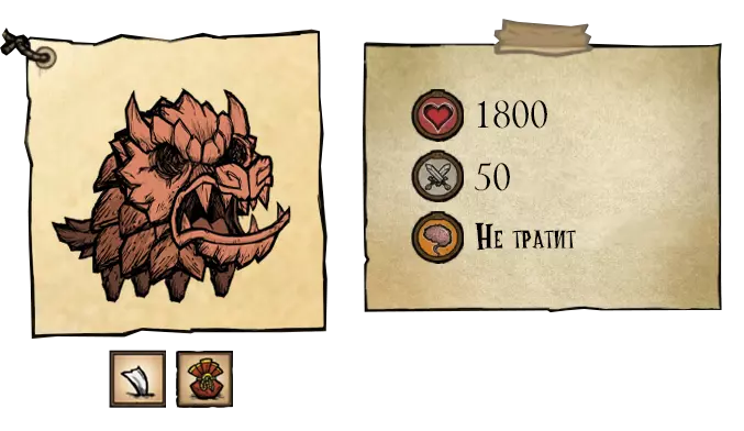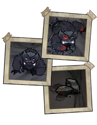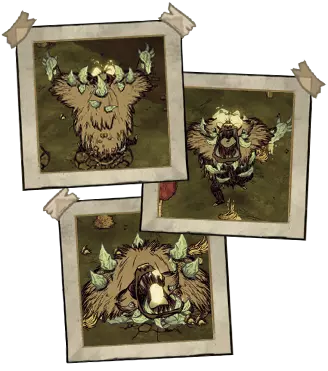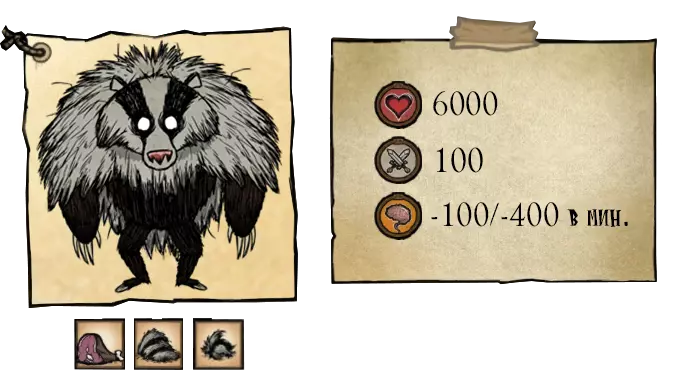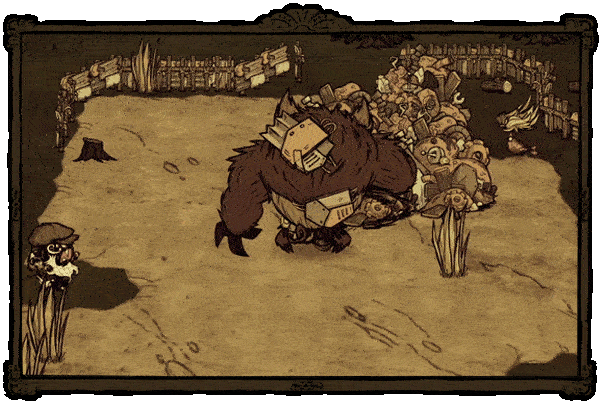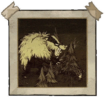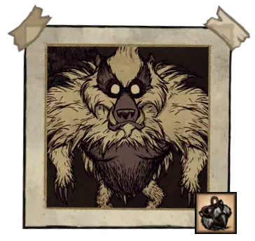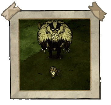 熊獾——秋日巨人。它不会在初秋出现。该首领初始状态为中立,它更感兴趣的是食物。为了食物,它会捣毁蜂巢,从玩家的箱子和冰箱里偷食物。这位贪吃的家伙会在秋5日出现,并且会像独眼巨人一样,在到来之前发出咆哮。每隔45秒,它就会掉落一撮自己的毛发。如果你在熊罴之前捡起食物,它就会变得充满敌意。杀死熊罴将获得它厚实的皮毛和8块肉。 ●════════════════════════════ஜ۩۞۩ஜ════════════════════════════●
