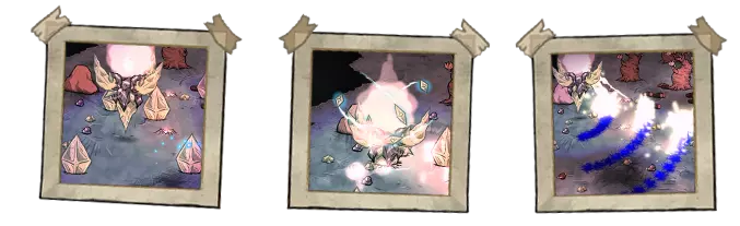 在月暴区域内,闪电会持续劈落,每次雷击后会生成一个充能玻璃巨石。用镐摧毁该巨石后,会掉落2-3个闪烁月碎片。闪烁月碎片会在1.5天内损坏,并转变为普通月碎片。巨石在生成20秒后会发生爆炸,对周围所有单位造成30点伤害。在月暴区域还会出现月之闪光,其行为类似孢子。它们漫无目的地四处飞行,但会追踪玩家,靠近时会对玩家造成10点电击伤害。电击命中时,如果角色装备了星尘或星尘在角色背包中,将为星尘充能10%的强度。月之闪光可通过捕虫网捕捉。 ●════════════ஜ۩۞۩ஜ════════════●