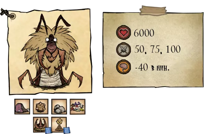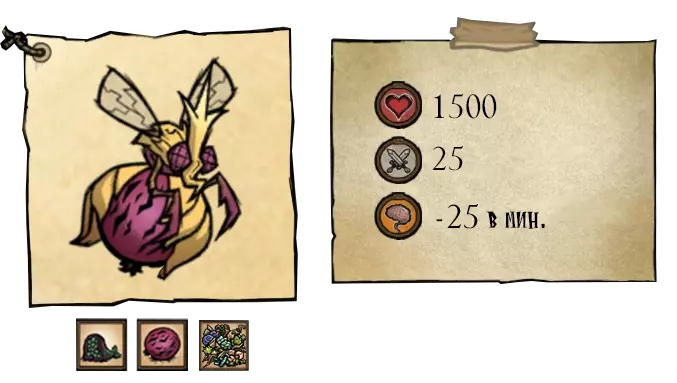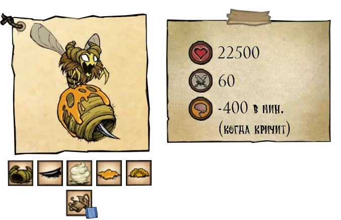 蜂后会用巨大的螫针攻击玩家并召唤雄蜂。在移动和攻击时,蜂后会留下蜂蜜轨迹,使玩家减速。战斗期间,附近所有蜜蜂都会对玩家表现出敌意。在第一阶段, boss会召唤4只雄蜂协助战斗。如果将所有雄蜂消灭, boss会毫不费力地再次召唤它们。第二阶段的生命值低于16875。在第二阶段,首领开始嘶吼,这会惊吓到普通生物并消耗理智。此外,她会额外召唤4个小怪,当3个小怪被击杀后,首领将再次召唤4个。因此,首领最多可召唤10个小怪。第三阶段为生命值低于11250点时。母体的攻击频率降低,但她的嘶吼会使小怪进入狂暴状态。狂暴状态下的小怪移动速度加快,伤害提升5点。小怪的狂暴状态持续6秒。●════════════ஜ۩۞۩ஜ════════════●