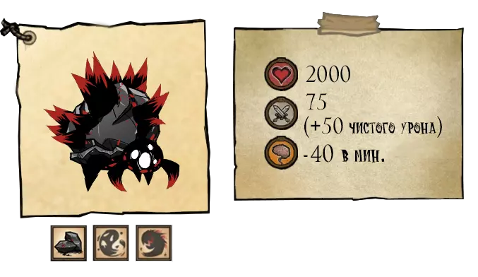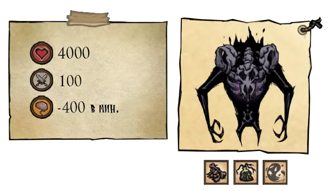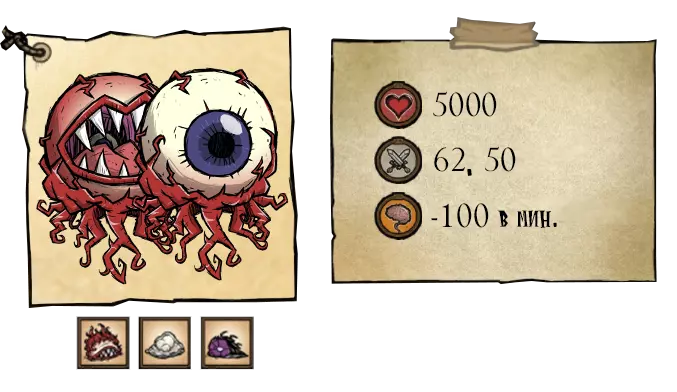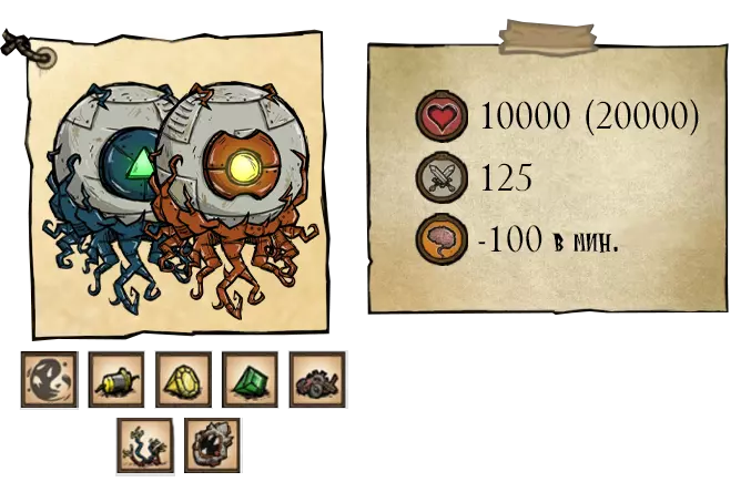 该 Boss 拥有 2 个阶段和多种攻击方式:1) 他会在短暂延迟后向玩家方向突进,对路径上的所有目标造成 125 点伤害。在第一阶段,该攻击为单次,但突进之间的间隔较短。视网膜撕裂者(Ретинайзер)的突进结束时间比痉挛(Спазматизм)更早;2) 在一系列突进后,Boss 会召唤其爪牙——小型惊骇眼球(生命值 200,伤害 20)。视网膜召唤它们的频率是痉挛的三倍。 ●════════════ஜ۩۞۩ஜ════════════● ●════════════════════════════ஜ۩۞۩ஜ════════════════════════════● 第二阶段——两个首领的总生命值降至13000单位以下。在第二阶段,双子会张开布满尖牙的嘴巴,它们的攻击速度加快,并且会使用新的攻击方式:1) 短暂延迟后,向玩家方向发动4-5次连续突进;2) 对自身下方发动攻击,若玩家靠近 Boss 则造成125点伤害(会生成一个小型漩涡,20秒后消失);3) 吐出2枚卵。●════════════════════════════ஜ۩۞۩ஜ════════════════════════════●