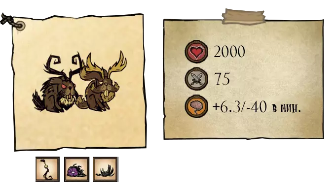 兔子王是所有兔子的统治者,也被称为受祝福的兔王。当在兔子洞里放置12-16根胡萝卜时,它就会出现。或者,如果玩家有幸找到并徒手抓住幸运兔子,也能召唤它——幸运兔子有1%的概率从兔子洞刷新,在洞穴地震期间刷新概率为10%。国王初始对玩家保持中立态度,可能会提供新的合成配方。他会对冒犯者穷追不舍,若对方试图逃跑,他会进行传送追击。若攻击国王,或携带肉类,抑或理智值较低,他就会变成狂暴的兔王。可在1个游戏日后再次召唤。存在一个兔子不听话的隐藏计数器。每当玩家击杀兔子或野兔时,会获得1点或3点叛逆值。一旦叛逆值达到上限(随机在20到30之间),国王就会出现。击杀国王后,会掉落国王兔之锤、1份怪物肉和2簇胡须。 ●════════════════════════════ஜ۩۞۩ஜ════════════════════════════●
