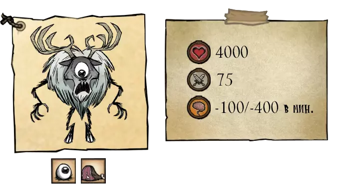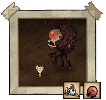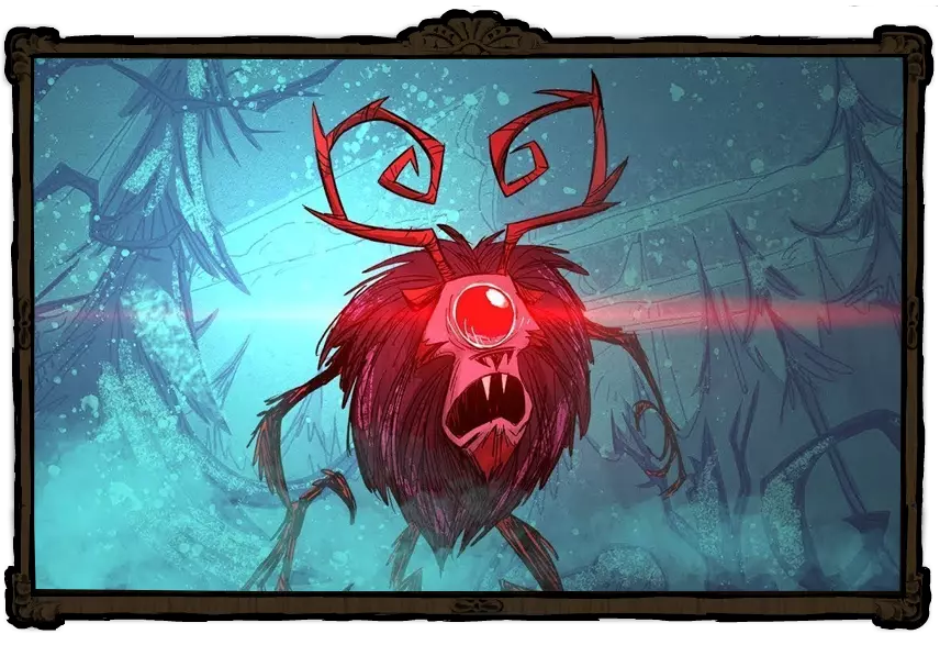 独眼巨鹿是新手玩家在冬季会遇到的首批巨人之一。在第30天的某个夜晚,玩家会听到令人毛骨悚然的呼吸声,这预示着它将在一分钟后出现。这个巨人天生具有攻击性,喜欢破坏建筑,例如玩家的基地、猪舍等。独眼巨人若摧毁多座建筑,虽会面露平静,但破坏欲并未消减。鹿首独眼巨人仅有一次攻击机会,不过该攻击会造成范围伤害并附带冰冻效果。这个巨人并非100%会出现,有可能整个冬天都不会有 boss 来袭。但这一情况不适用于第一个冬天。在冬季使用敌方信号火箭有60%的几率召唤冰原巨鹿,但如果世界中已存在一只,新的巨鹿将不会出现。这使得在一个冬季内可以击杀多只冰原巨鹿。击杀后,冰原巨鹿会掉落8块肉和它的眼睛,眼睛可用于特殊制作。此外需要说明的是,该巨鹿为雌性。●════════════════════════════ஜ۩۞۩ஜ════════════════════════════●