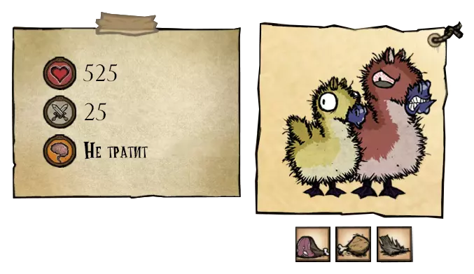 幼兽不会原谅杀害母亲的凶手。幼兽会快速旋转形成漩涡并直线冲向玩家发起攻击。有时幼兽的攻击会伴随闪电打击,闪电不会对幼兽造成伤害,但会点燃它们。幼兽死亡后会掉落1块肉、1根骨头和2-3根羽绒羽毛。